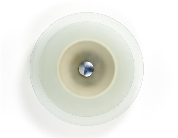 Lampada a plafone con struttura in alluminio laccato bianco, rosetta in alluminio e due dischi diffusori in vetro parzialmente acidato. Italia, anni '60. (d cm 60) (lievi difetti)