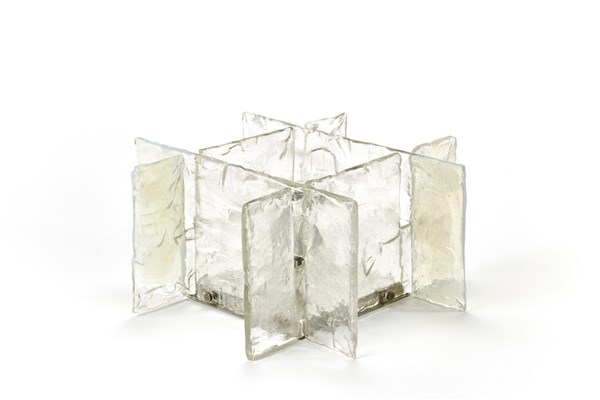 Lampada da soffitto in vetro trasparente incolore corrugato e parzialmente iridato. Produzione Mazzega, Murano, anni '70. (cm 40x21,5x40)