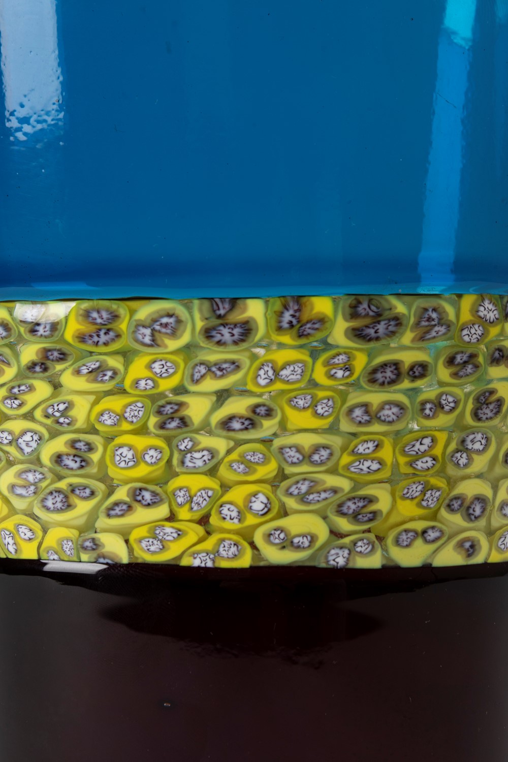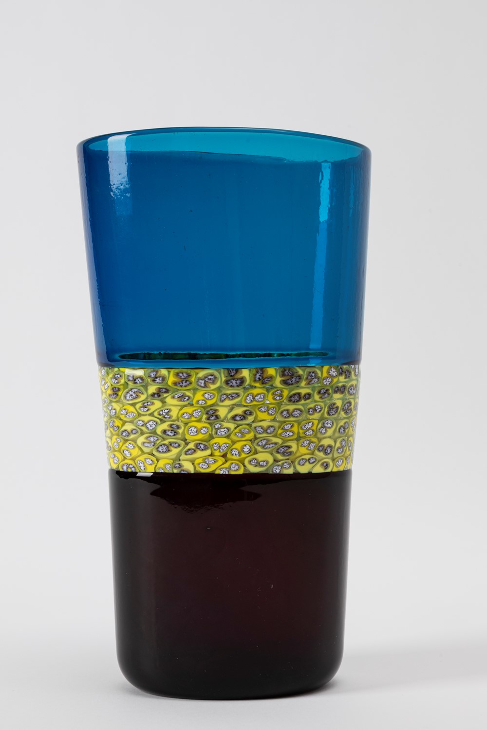 tronco conico asimmetrico in vetro soffiato a due incalmi con fascia centrale a murrine a spugna. Firma ad acido Venini Murano Italia.