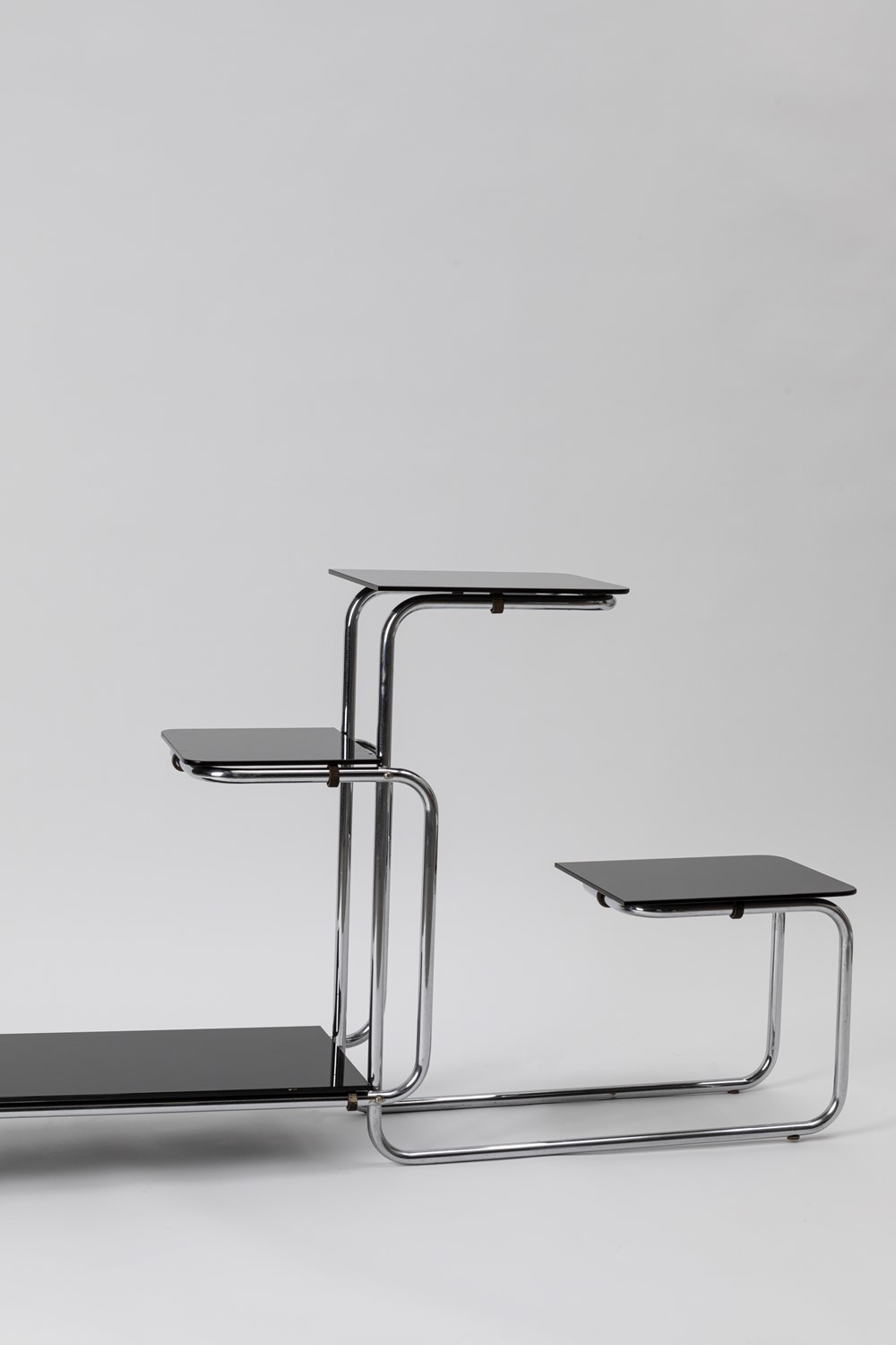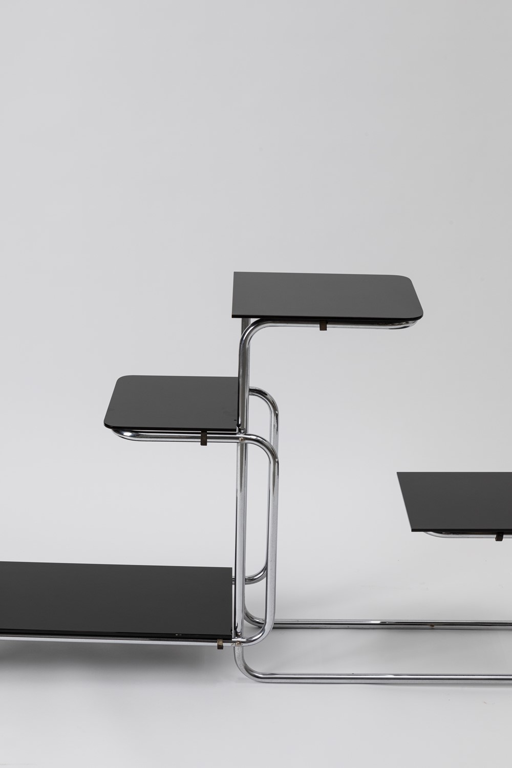 struttura in tubolare di acciaio cromato, mensole in vetro originale d’epoca di colore nero con particolare lavorazione a righe nel lato sottostante. Fermavetri originali in gomma rigata. Thonet cm 127x71x27
