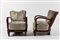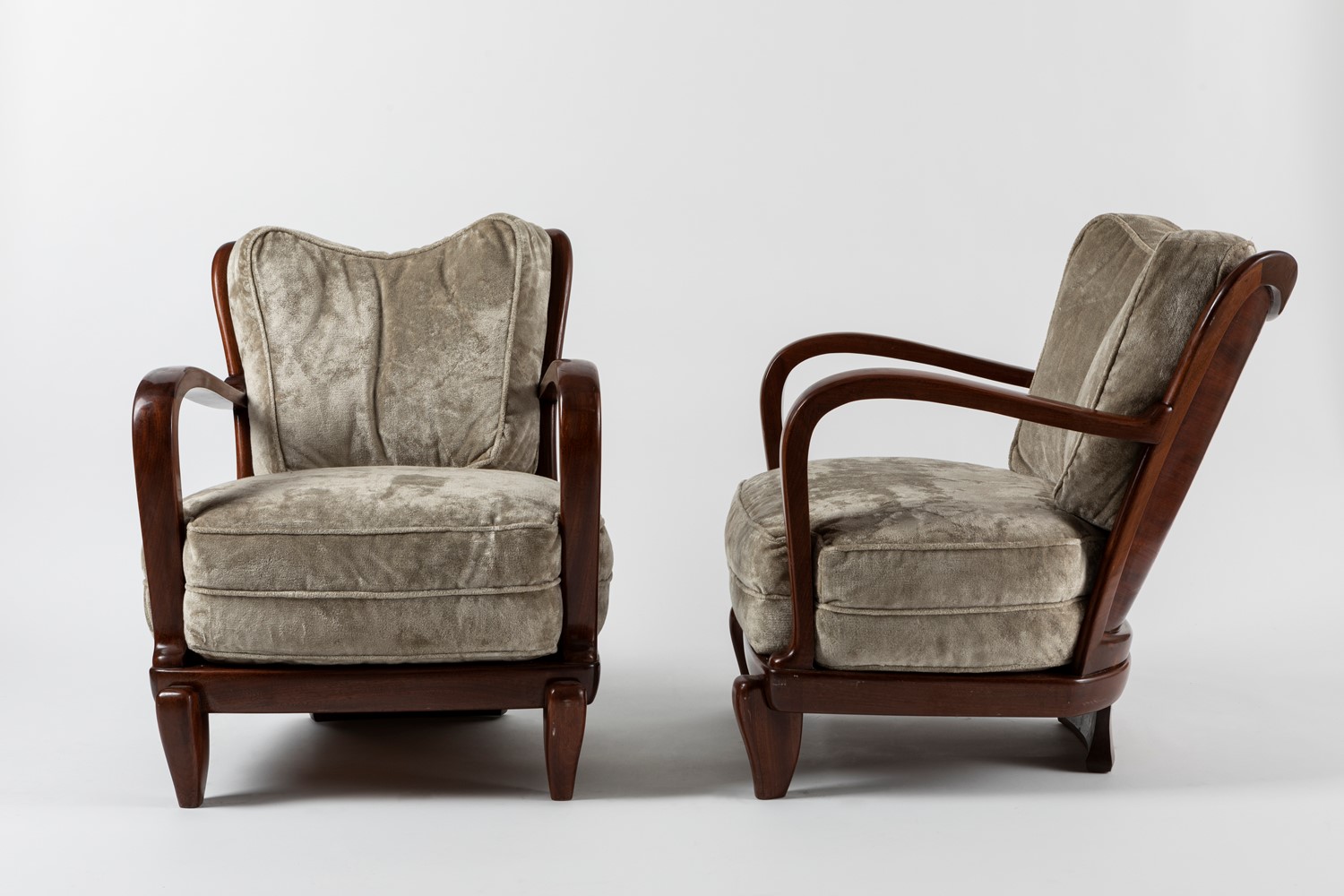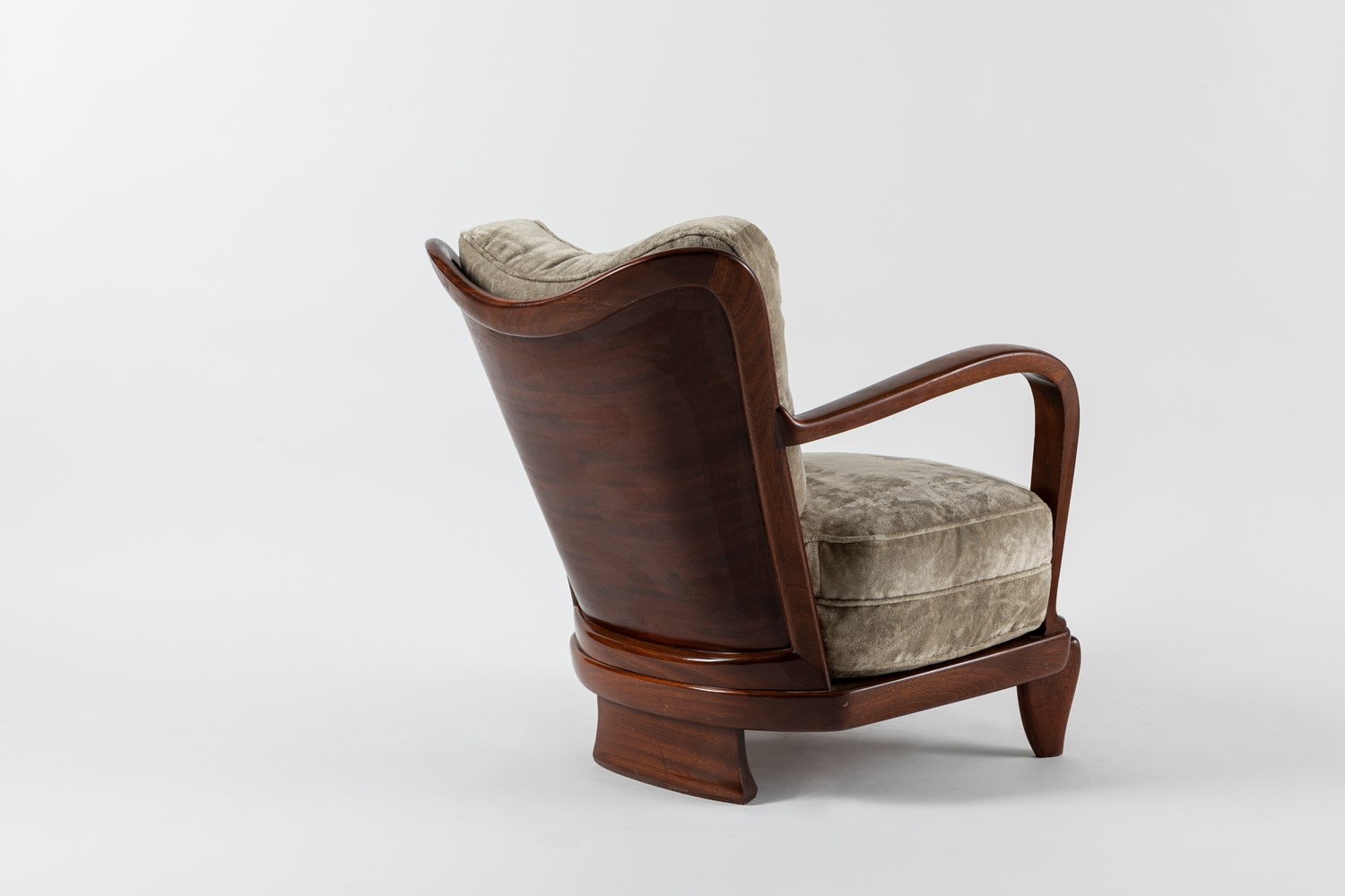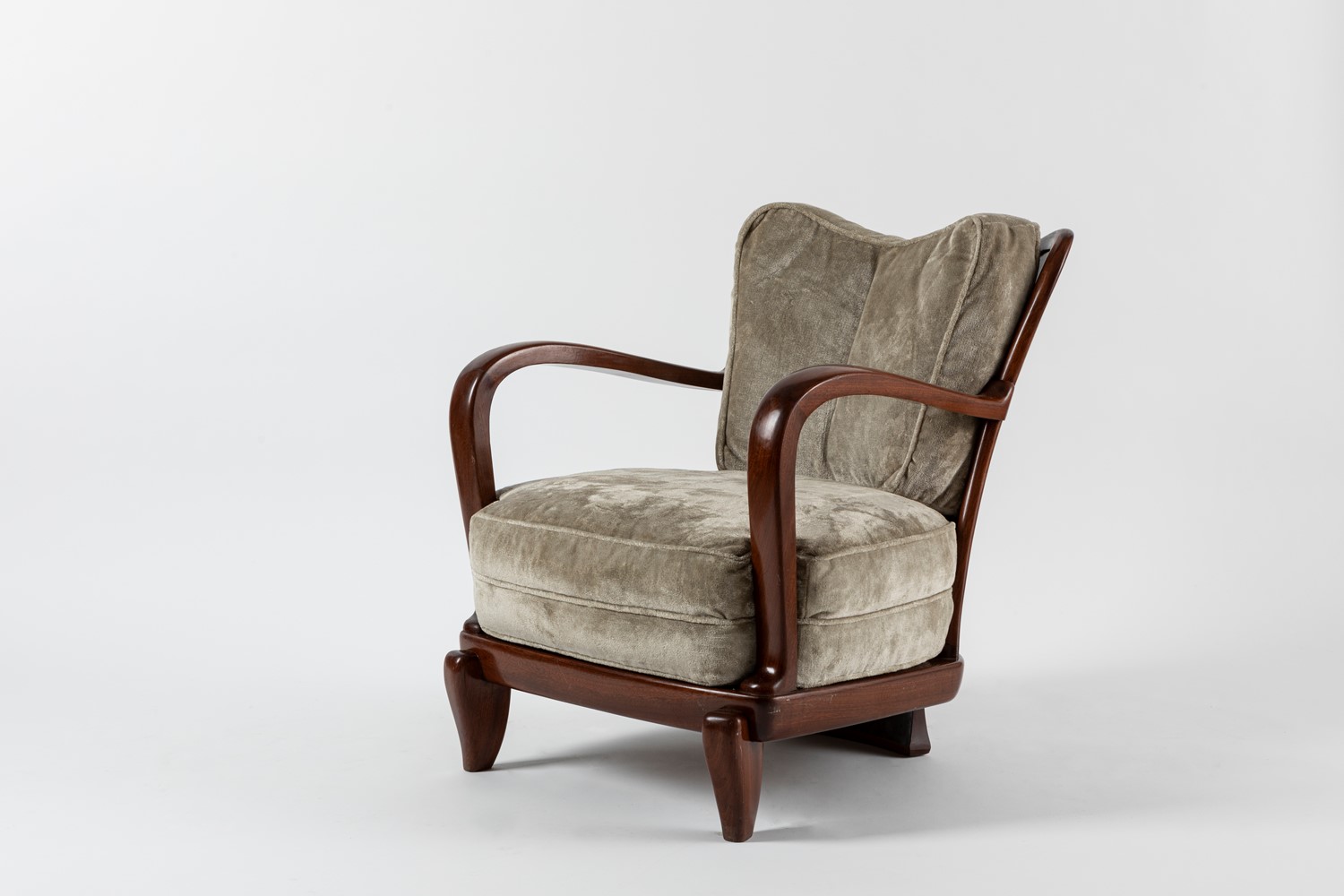 in legno di noce e radica, seduta e schienale rivestiti in velluto.
