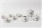 tazzine: diam 8 x 5 cm; piattini: diam 12 cm; teiera h 15 cm; lattiera 9 cm; zuccheriera h 10 cm