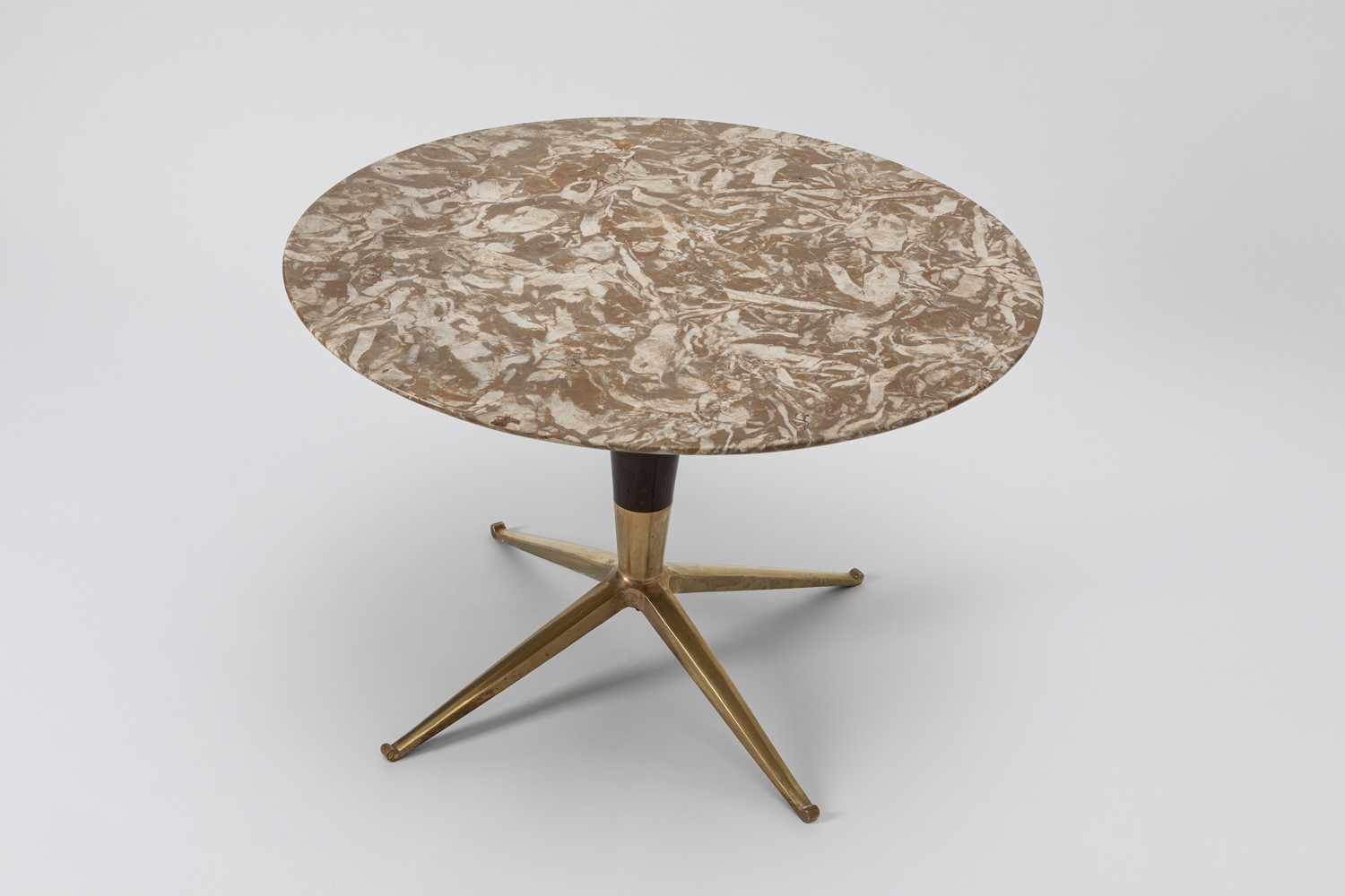 con gambe in metallo verniciato e ottone, piano in marmo.