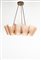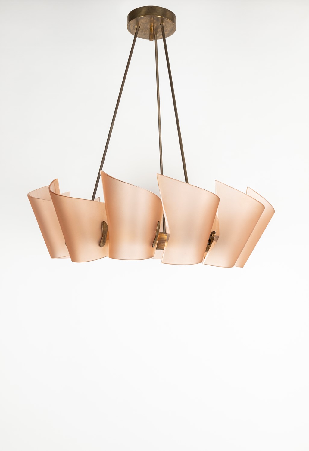 in ottone lucido con dodici diffusori in vetro rosa curvato molato e sabbiato.