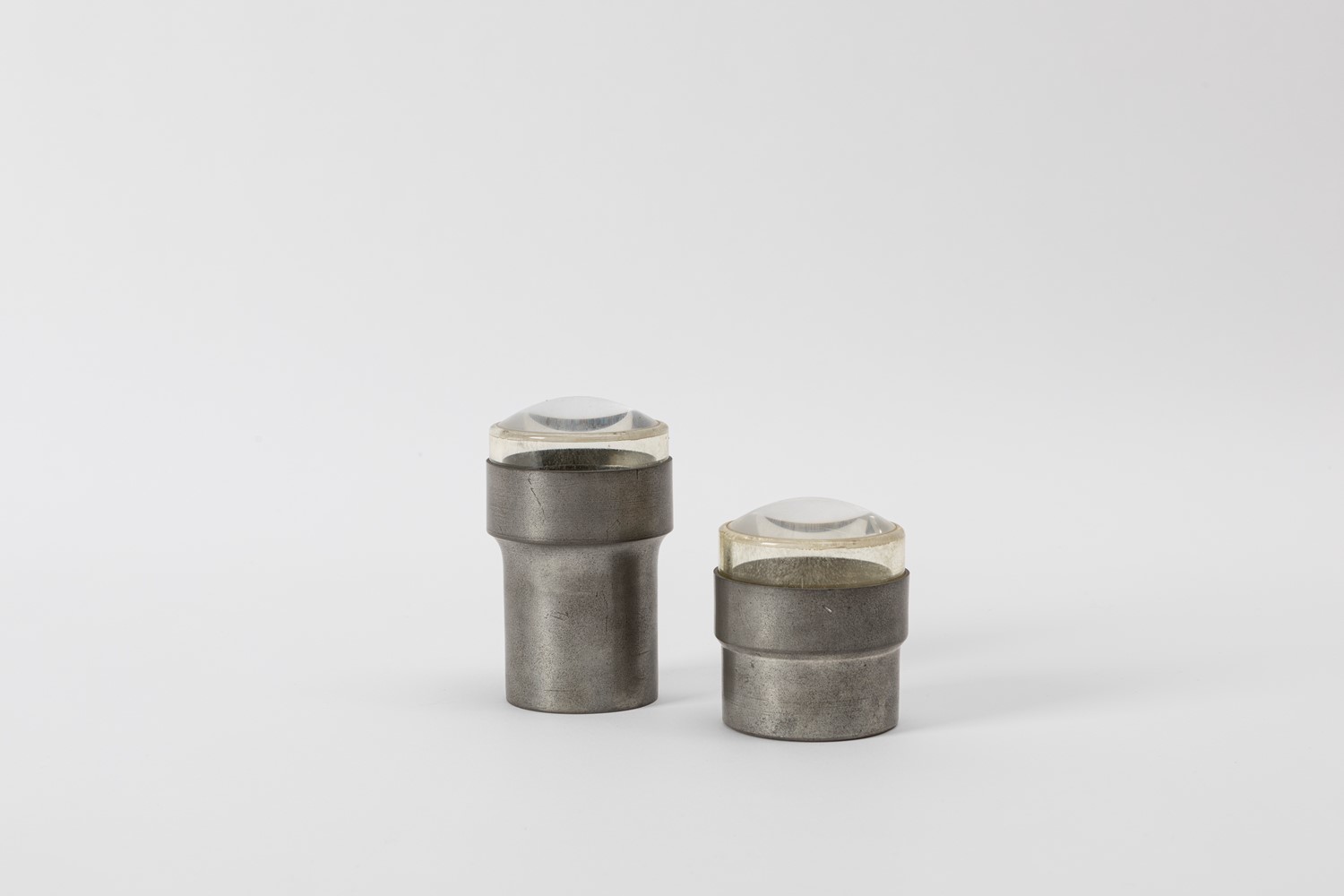 Alluminio e plexiglass lavorato a lente.Etichetta cartacea sulla base della Galleria.