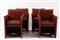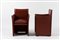 in pelle. Poltroncine con braccioli. Struttura a pannelli; telaio portante in acciaio; imbottitura in poliuretano espanso schiumato; cerniere lampo cucite nel rivestimento. Cuscino sedile imbottito in piuma.