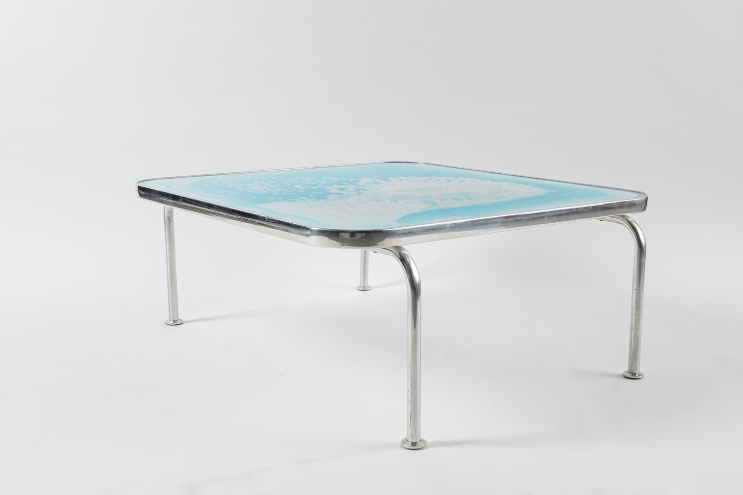in metallo cromato, legno laminato, plastica, liquido colorato.