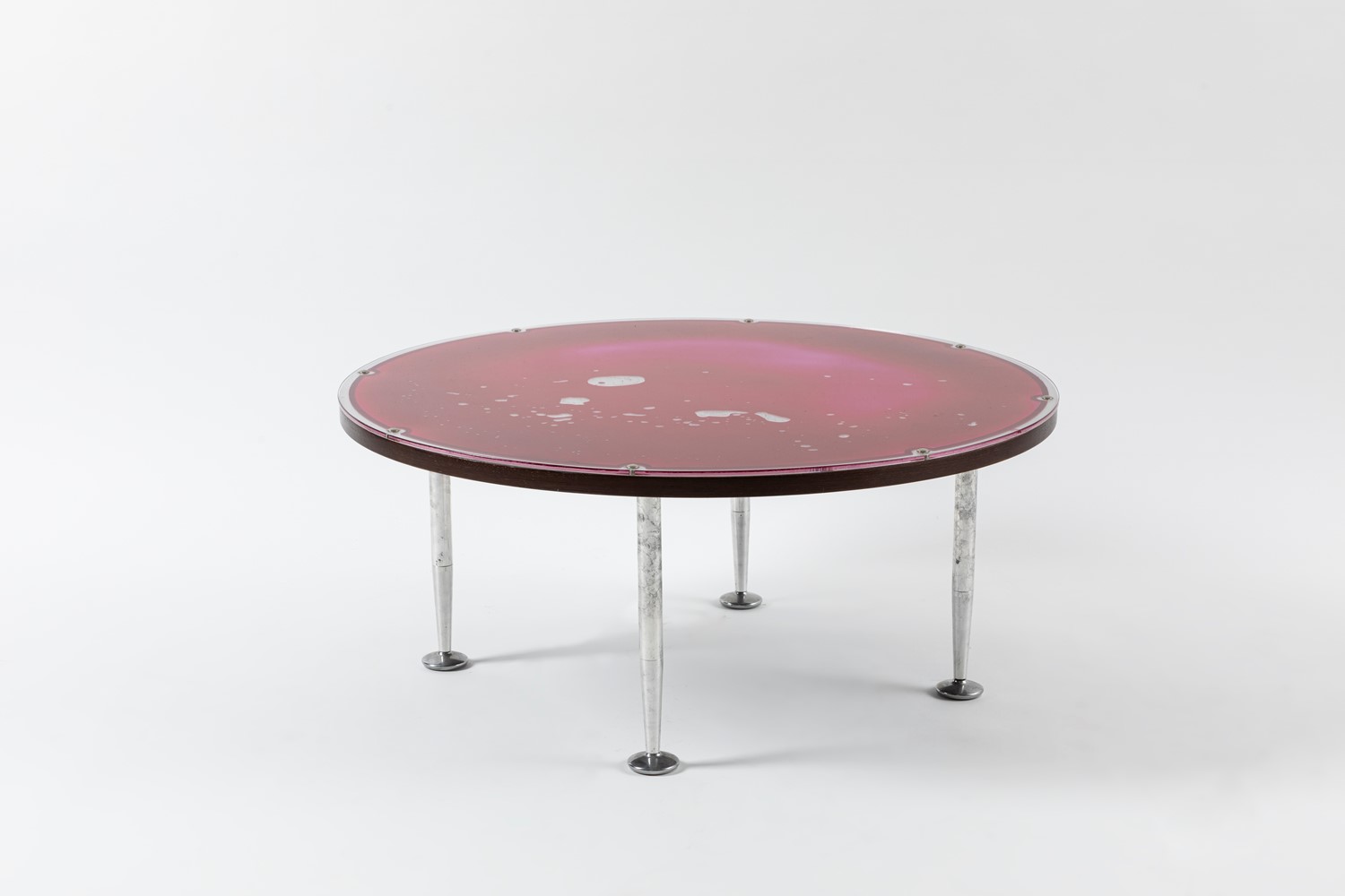 in metallo cromato, legno laminato, plastica, liquido colorato.