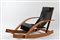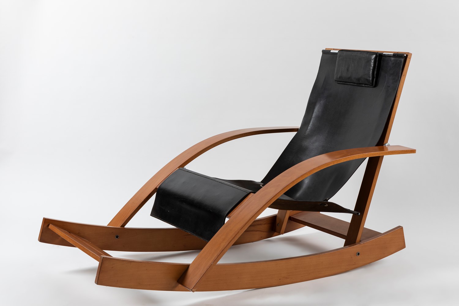 in legno curvato e cuoio nero, con cuscino poggiatesta.