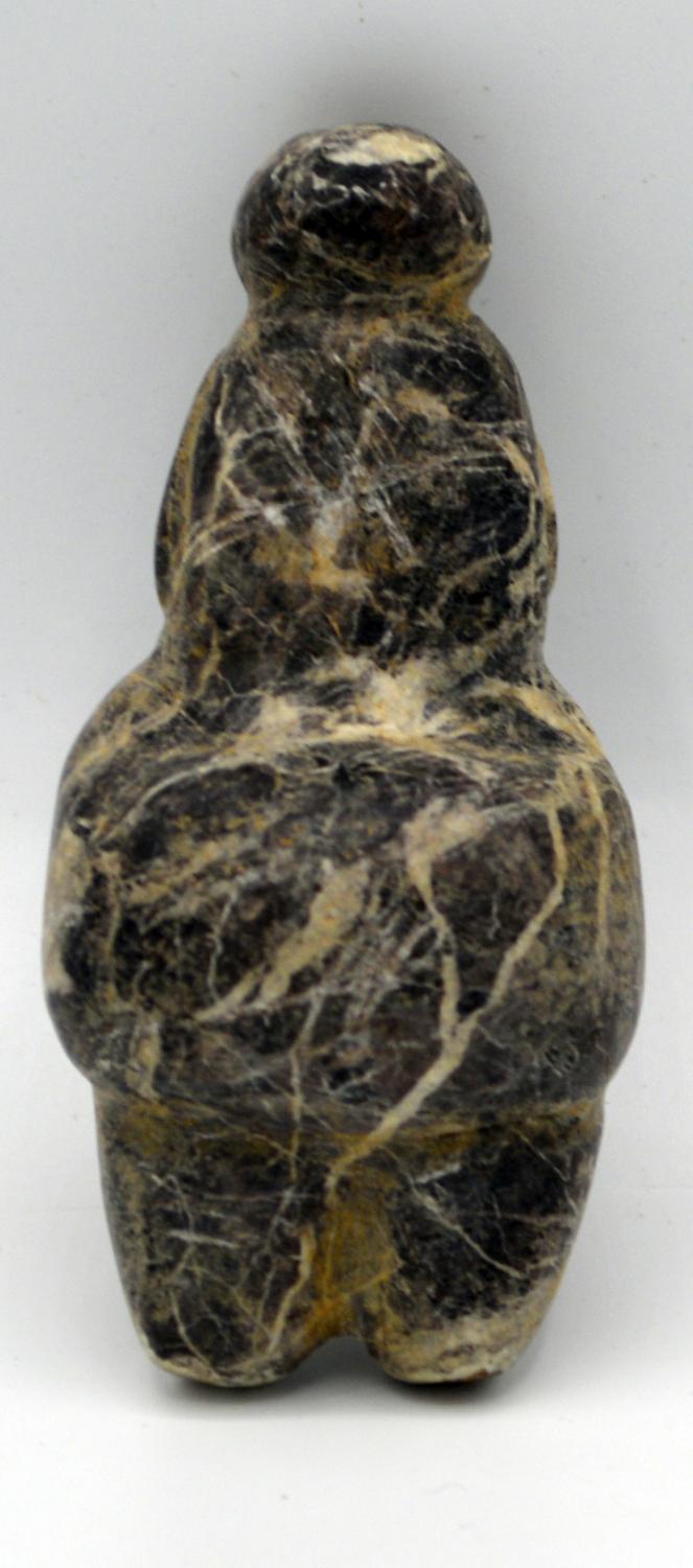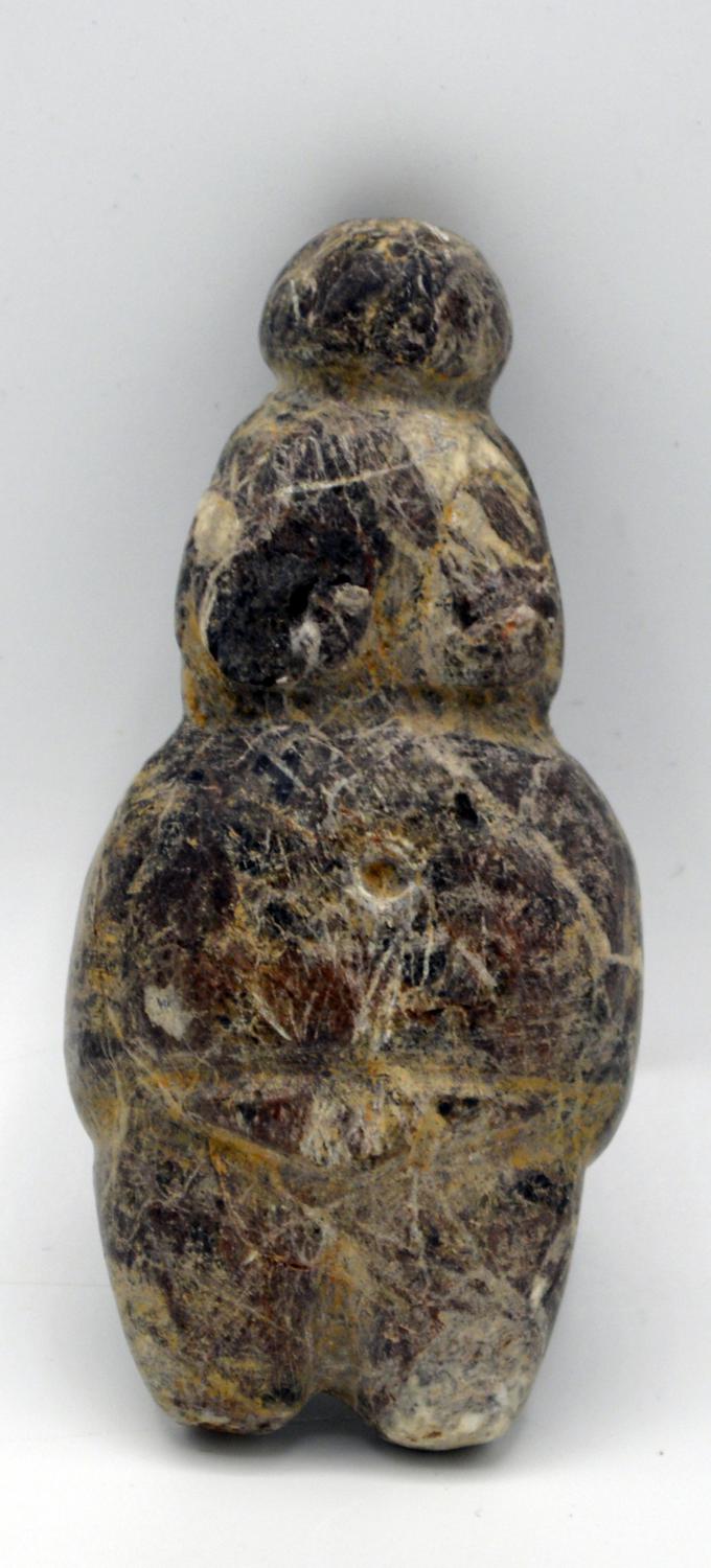 Statuetta di dea madre steatopigia raffigurata stante, con testa sferica senza indicazione del volto, con grandi seni, ampio ventre, gambe corte e tozze, sesso e natiche in evidenza.
