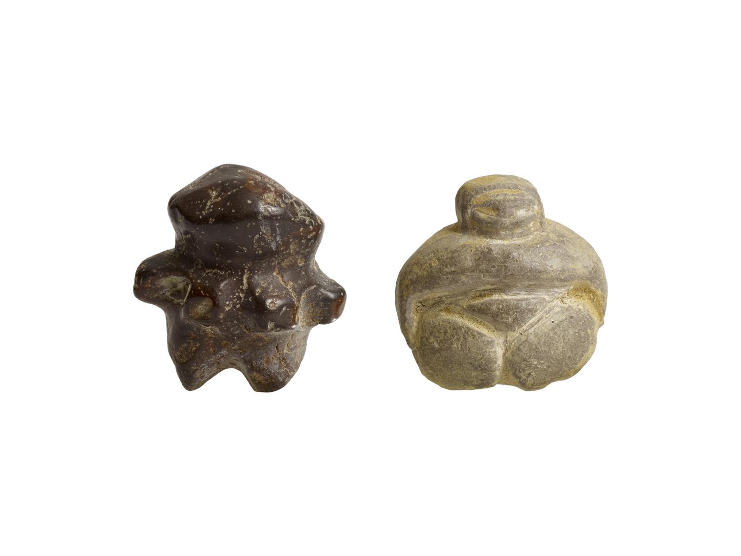 Due figure femminili stilizzate e stanti, una con testa sferica con indicazione di occhi, naso e bocca, braccia lungo i fianchi che enfatizzano le forme prominenti della piccola figura, (2)
