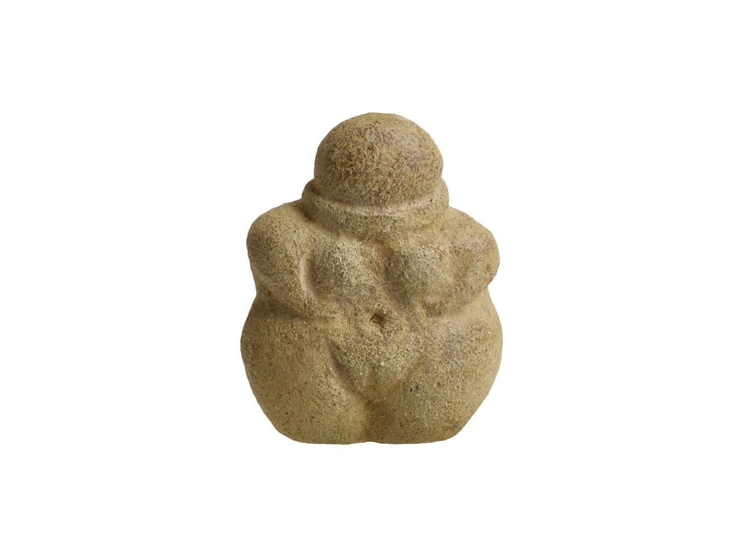 Figura femminile stilizzata stante con testa sferica senza indicazione del volto, con collana, braccia sul ventre che evidenziano i grandi seni, gambe diritte con pube e grandi natiche in evidenza