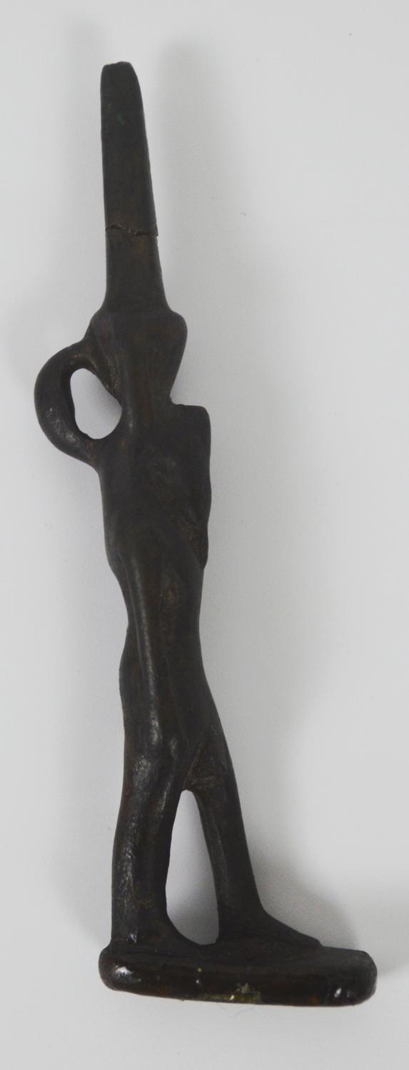 Amuleto in bronzo raffigurante il dio Nefertum, riconoscibile per la caratteristica corona col fior di loto e le piume, in posizione frontale col piede sinistro avanzato e l'altro arretrato; stante su base rettangolare e provvisto di anello per la sospensione sulla nuca.