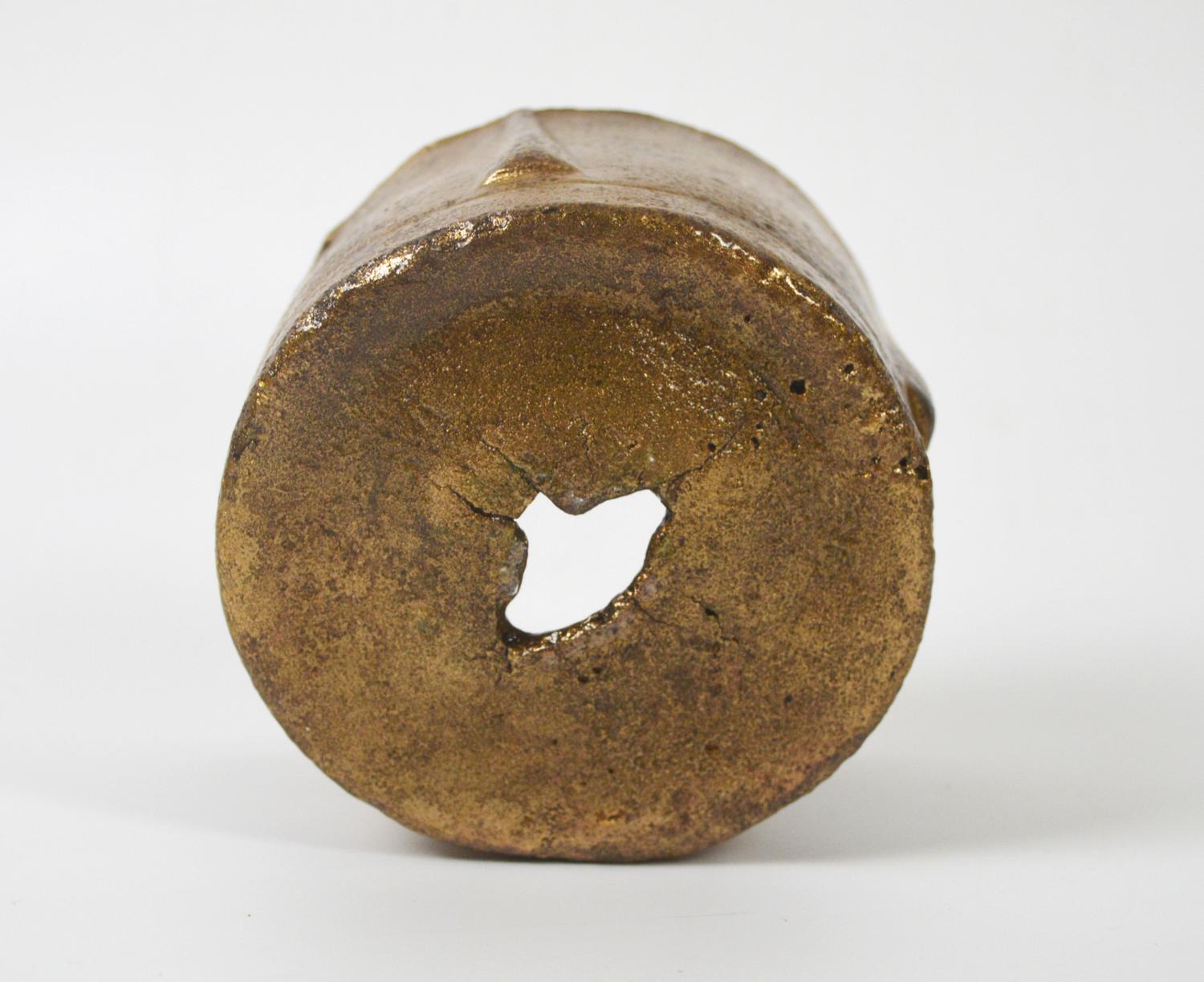 Mortaio in bronzo con orlo ingrossato, vasca cilindrica con quattro costolature in rilievo, fondo piatto.