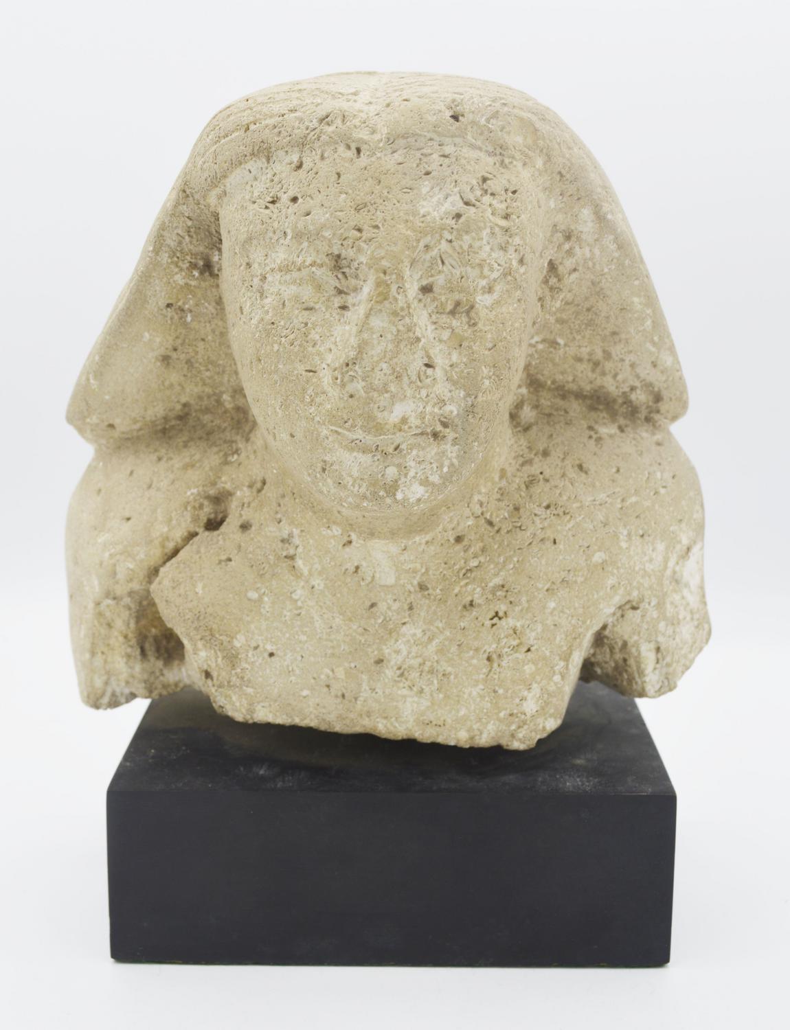 Parte superiore di statua maschile, raffigurante un uomo a torso nudo che indossa una parrucca striata a larghe falde che arriva a coprire le spalle; l'uomo ha fronte ampia, grandi occhi allungati con palpebre evidenziate, naso largo e bocca sottile.