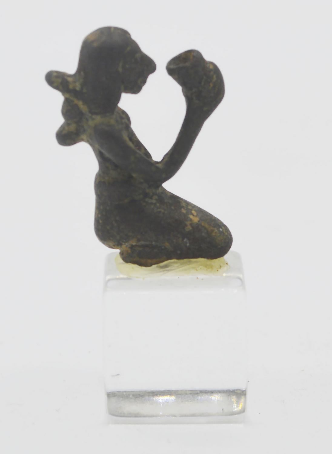 Figura femminile inginocchiata che tiene con entrambe le mani una coppa cilindrica vicina alla bocca. I capelli lisci scendono sulle spalle in una acconciatura bipartita che, sul retro, si annoda originando un anello per la sospensione. I tratti del viso sono sono ben definiti, mentre le braccia sono innaturalmente lunghe e sottili. Corpo decorato di fitta punteggiatura. Sia la posizione che la pettinatura sono caratteristiche dell'arte elamita.