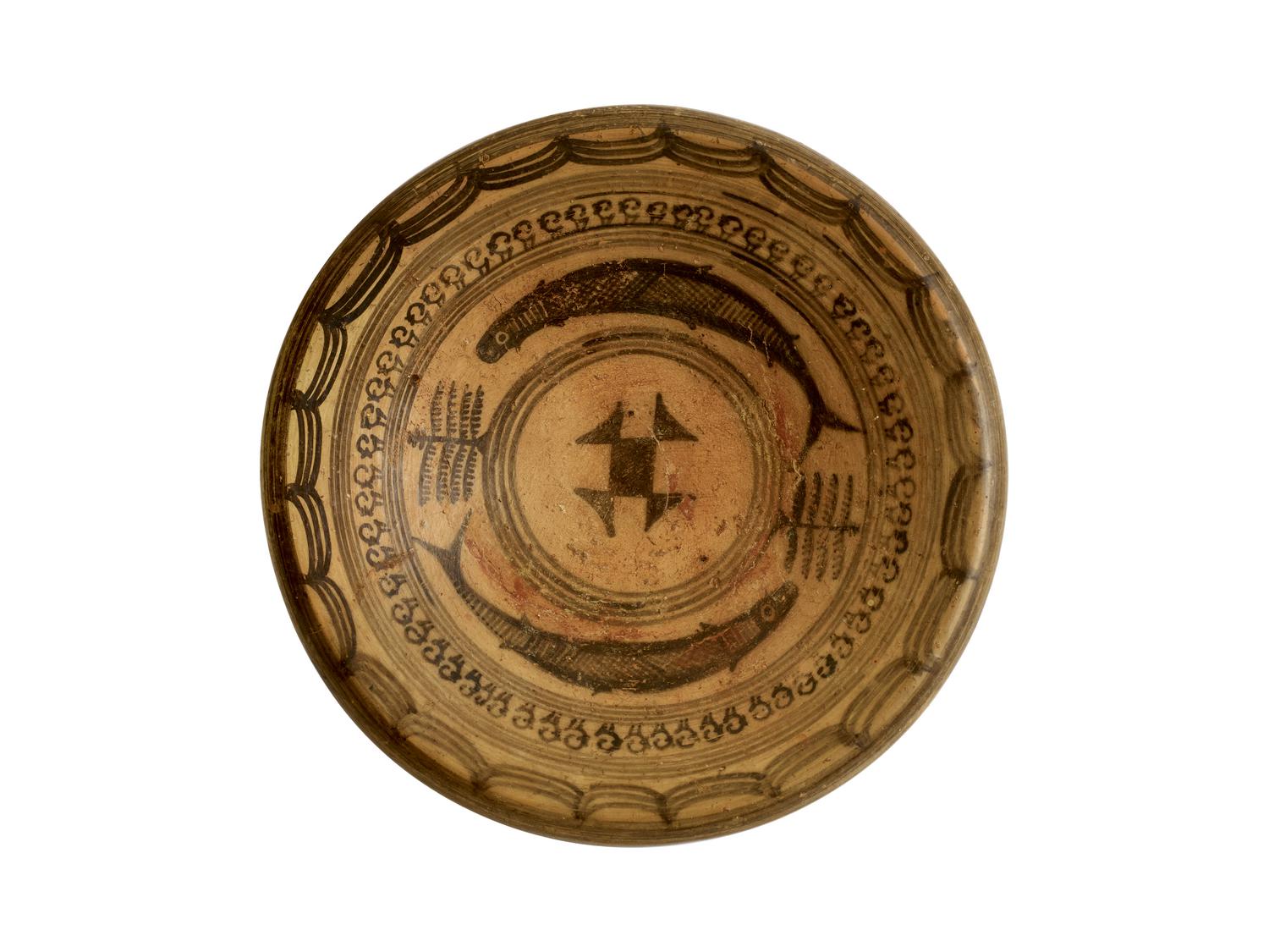 Piatto su piede dipinto in bruno con, al centro, due pesci separati da due piante e sul bordo esterno una serie di capridi o stambecchi.