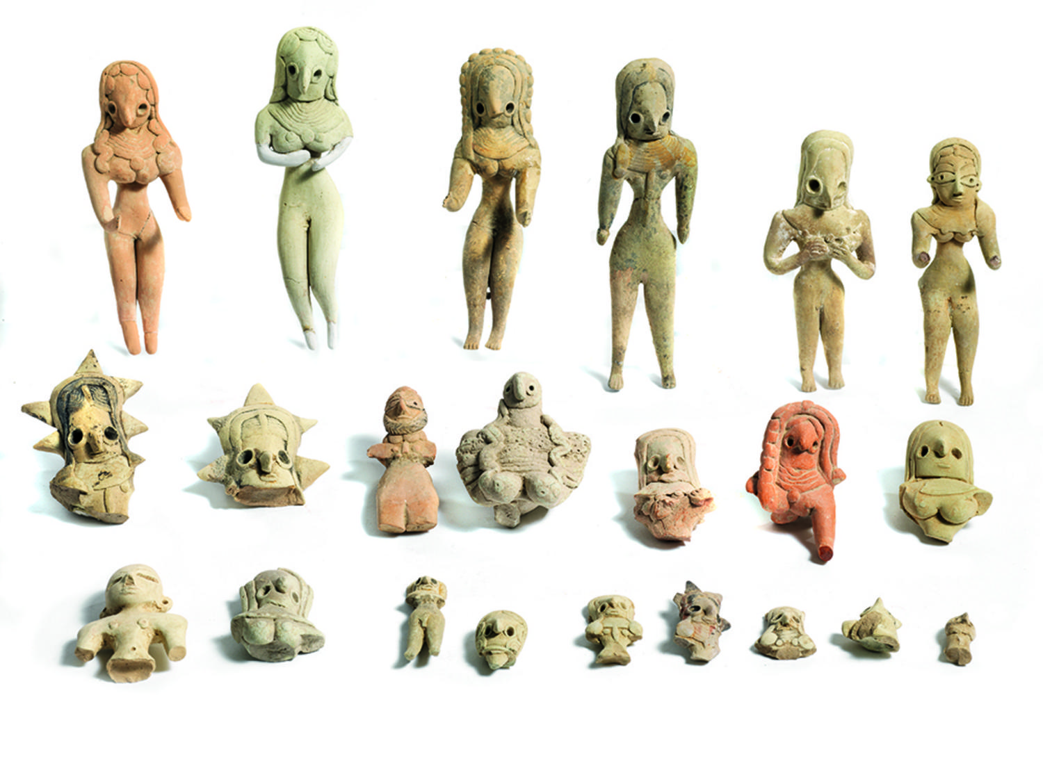 Ventidue statuette sedute e stanti raffiguranti Dea Madre nuda con collane, teste stilizzate con becchi di uccello, elaborata acconciatura, con braccia protese a sostenere un bambino o stese lungo i fianchi (22)