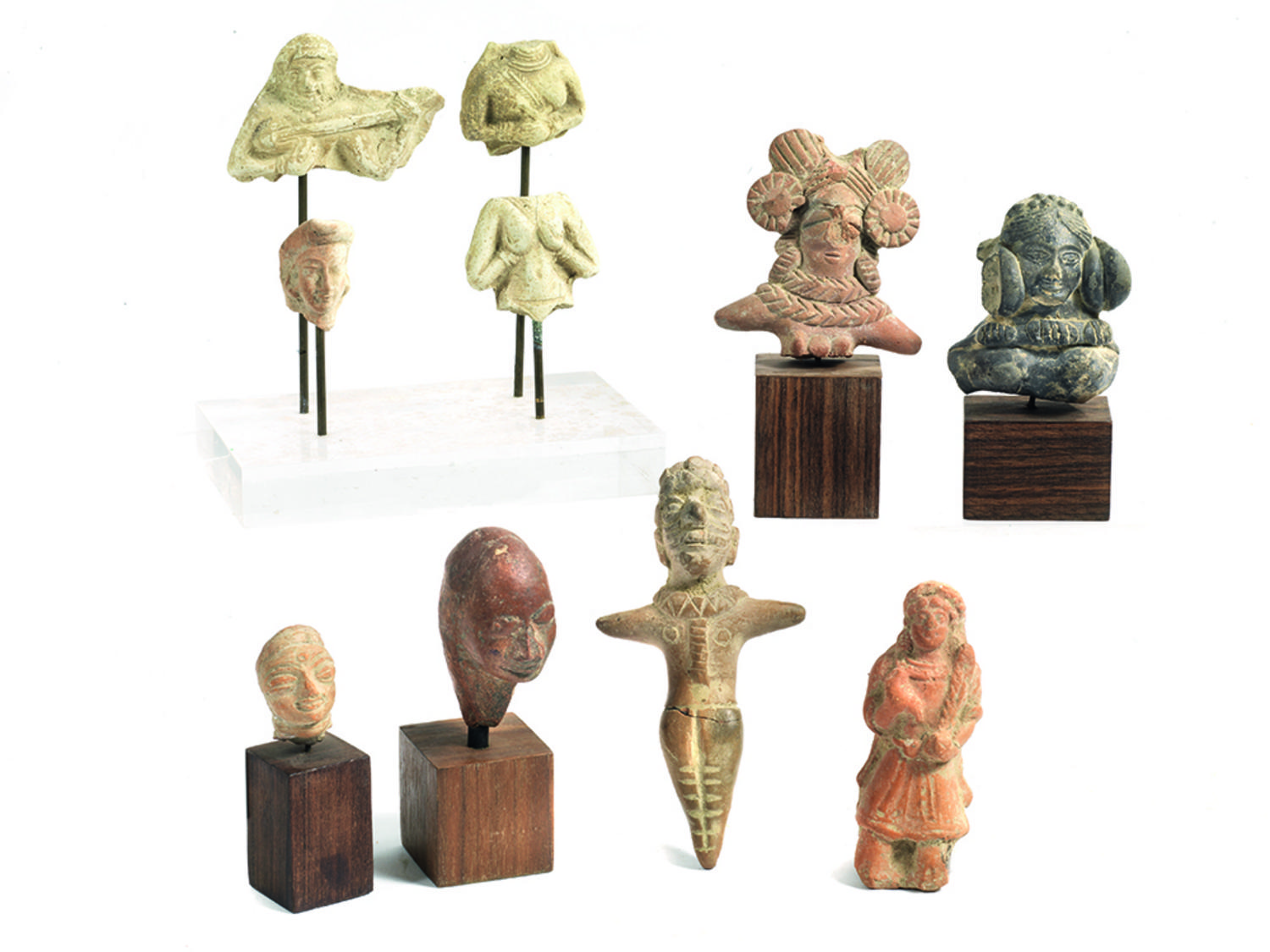 Quattro statuette elamite frammentarie raffiguranti due busti di divinità femminili, probabilmente la dea Ishtar, un suonatore di uno strumento a corde ed una testa di divinità; due teste di divinità femminili indiane con elaborate acconciature dei capelli e grandi orecchini e due teste maschili stilizzate; idolo maschile stilizzato nudo e stante, con le braccia distese ed una collana e figura maschile stante con chitone corto rython nella mano destra e palma nella sinistra (10)