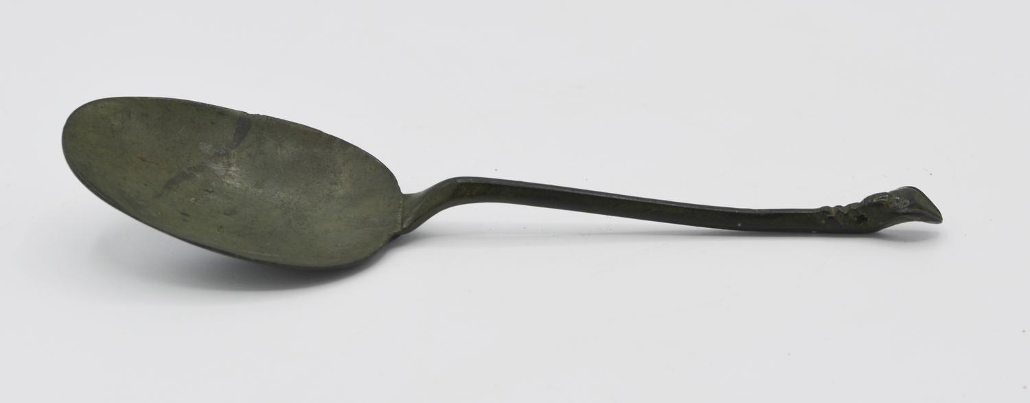 MATERIA E TECNICA: ferro forgiato ed avorio intagliato; un cucchiaio con vasca ellittica e manico in verga di bronzo.