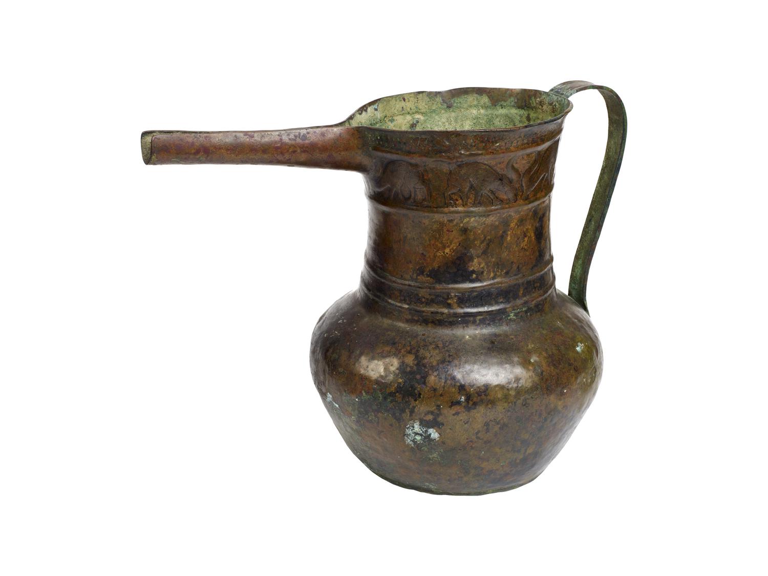 Brocca in bronzo con lungo becco versatoio, collo cilindrico, corpo globuare schiacciato, fondo piatto, ansa a nastro impostata dall'orlo alla spalla. Fascia sotto l'orlo decorata a sbalzo con un motivo a guilloche ed un registro di figure con capridi pascenti e affrontati