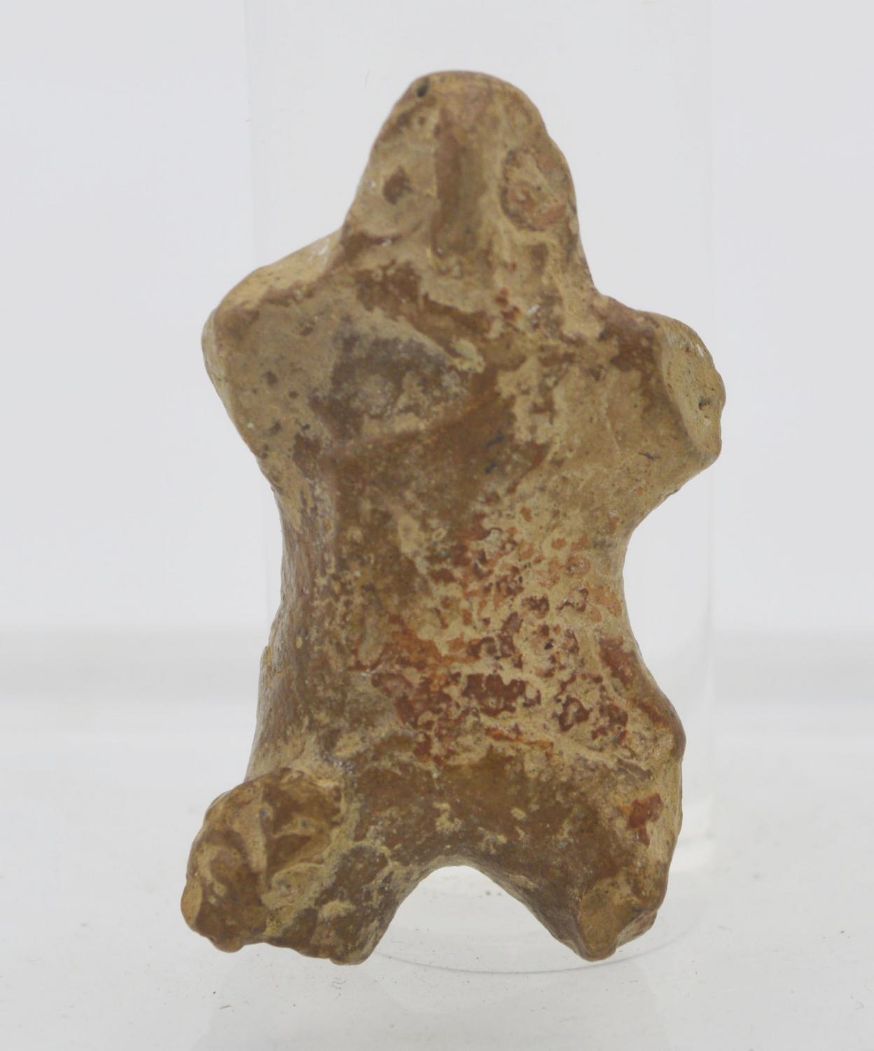 Figura umana rozzamente modellata con corpo tozzo, brevissimi arti e testa triangolare con grandi occhi circolari, naso aquilino.