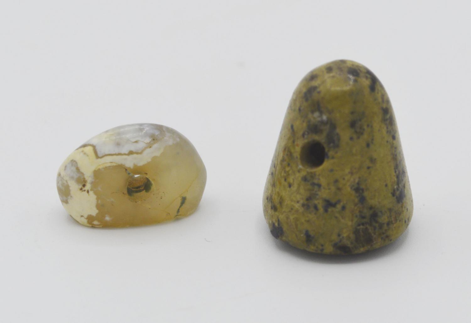 Due sigilli a stampo conici, uno in radice di smeraldo a forma conoidale e l'altro in pietra chiara con venature bianche. Entrambi presentano un foro nella parte superiore; il primo presenta incisa una scena di lotta tra un uomo e un leone, l'altro la raffigurazione di un uomo stilizzato.