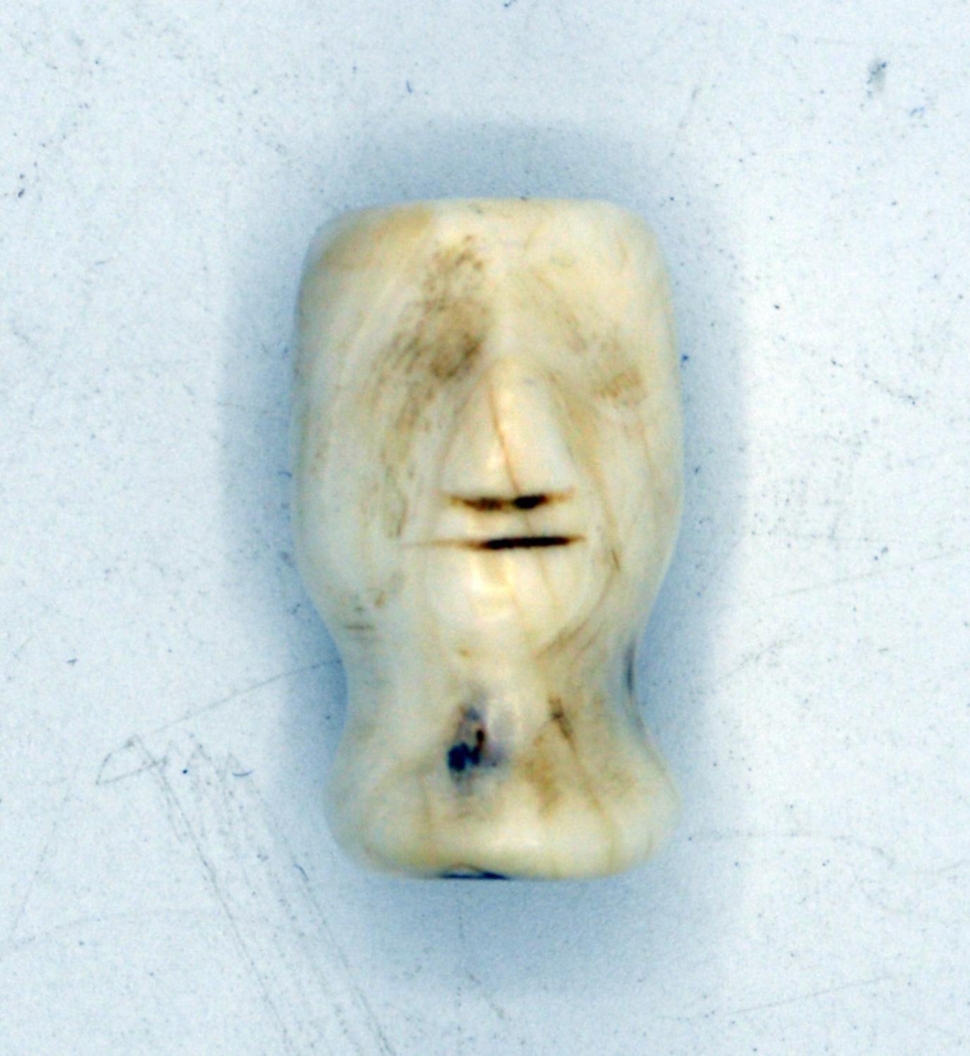 Piccola testa umana stilizzata pertinente ad una statua in materiali compositi, con grandi occhi amigdaloidi, naso affilato e bocca resa mediante linee incise.