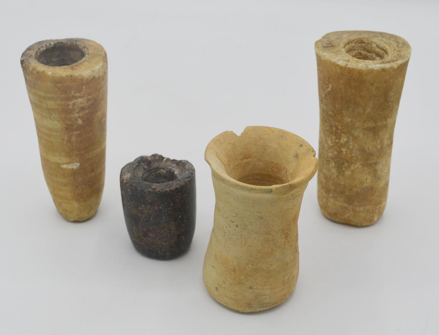 Due idoli a pilastro di forma a colonna subcilindrica e due colonnine, una in pietra nera ed una in terracotta con incavo nella parte superiore, utilizzate probabilmente come lucerne.