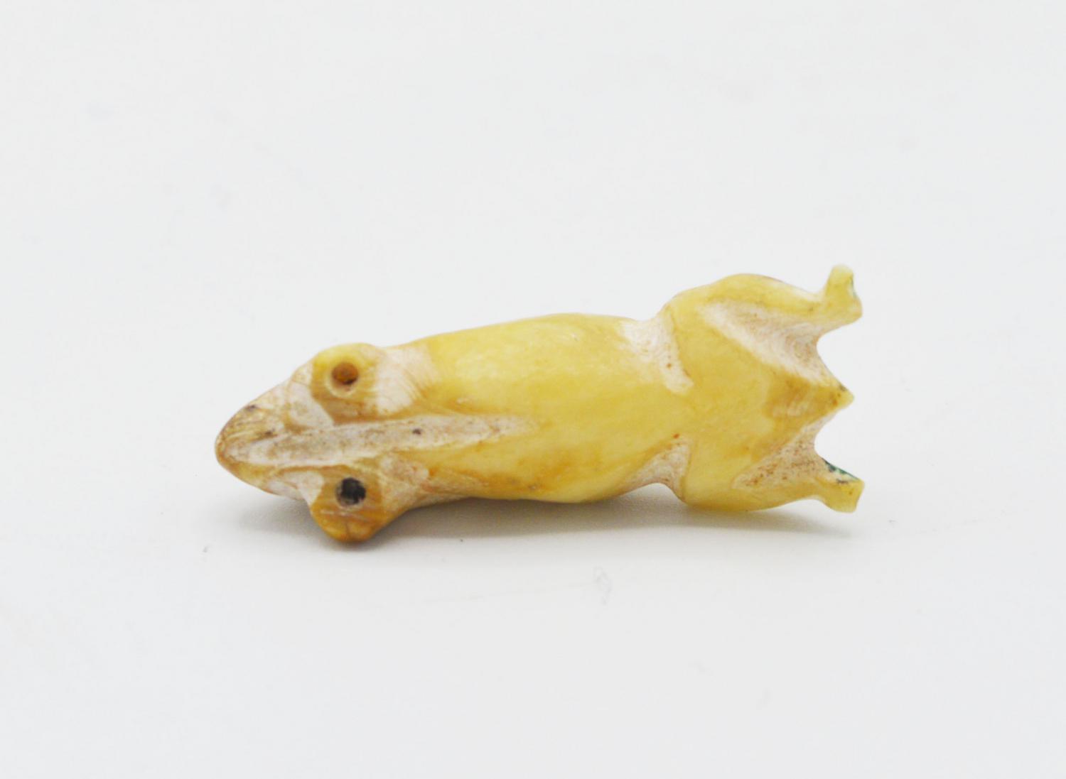 Piccolo rospo eseguito in osso. Gli occhi cavi erano senza dubbio riempiti con un castone in materiale diverso.