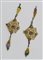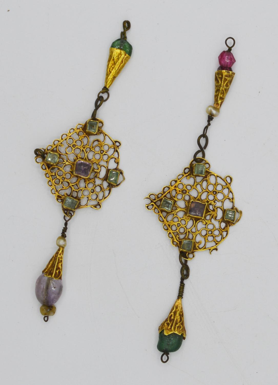 Coppia di orecchini realizzati in oro traforato a giorno di forma subcircolare con quattro castoni quadrati con vetri o pietre dure e ciascuno con due pendenti conici con pietre dure colorate. (2)