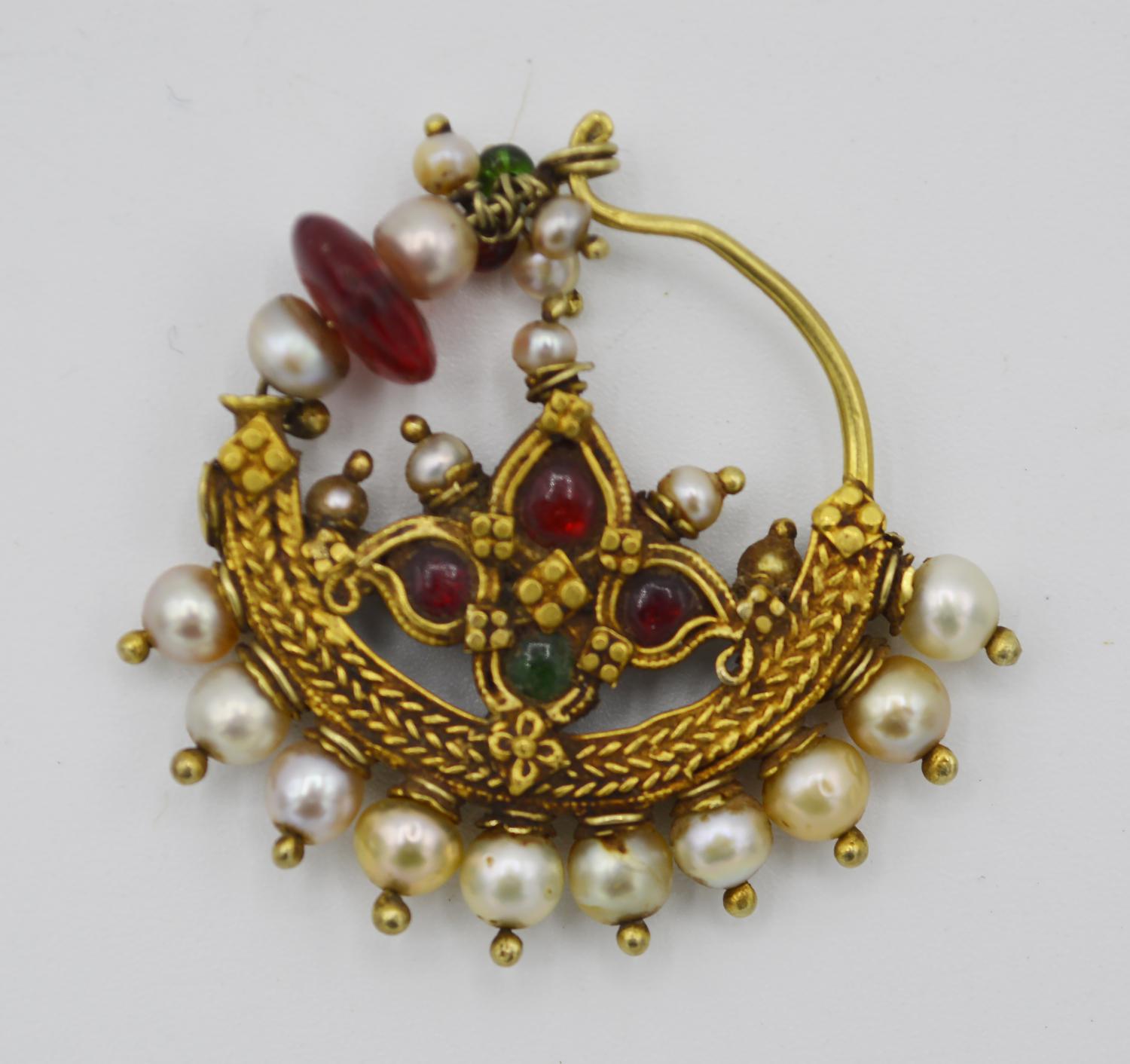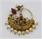 Orecchino con parte superiore in filo d'oro sul quale sono infilati granati e piccole perle, parte inferiore semilunata sormontata da un fiore stililzzato in granati e perle e con dieci piccole perle pendenti.