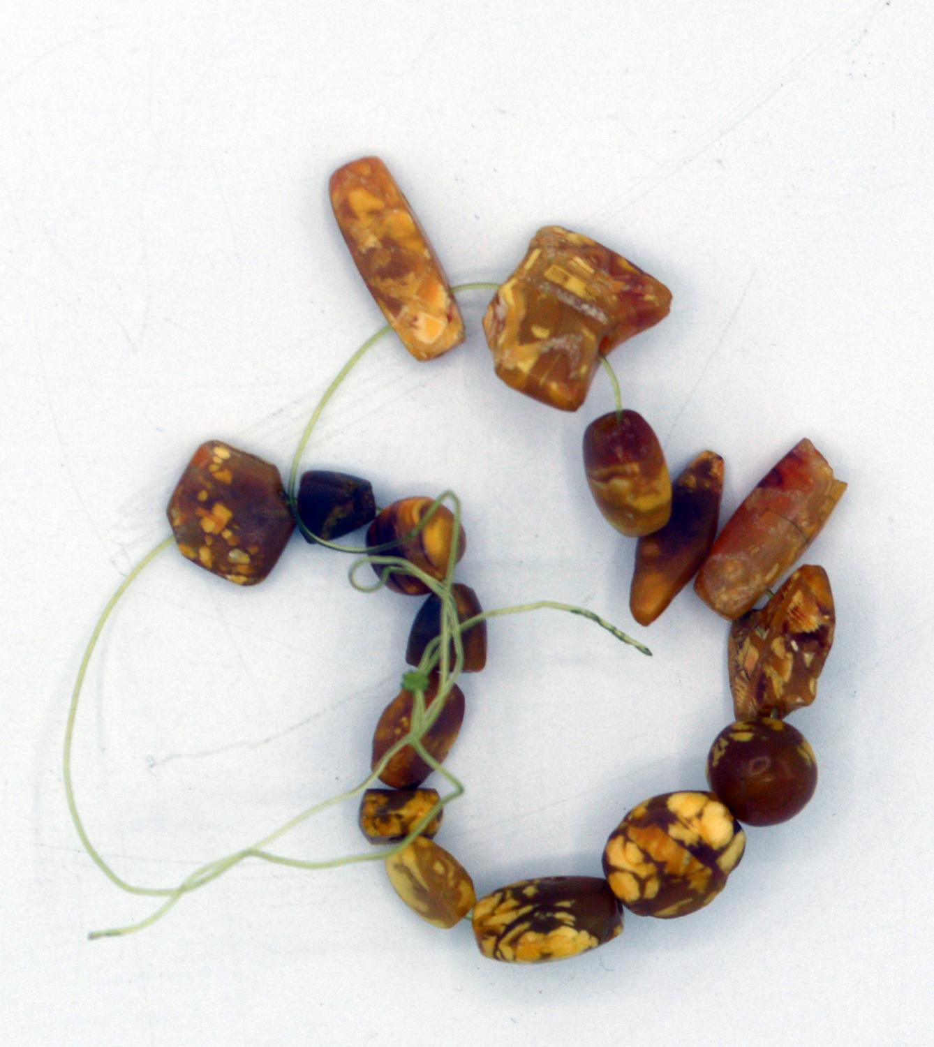 Collana con vaghi di differenti forme in corniola decorati in bianco con l'uso di acidi.
