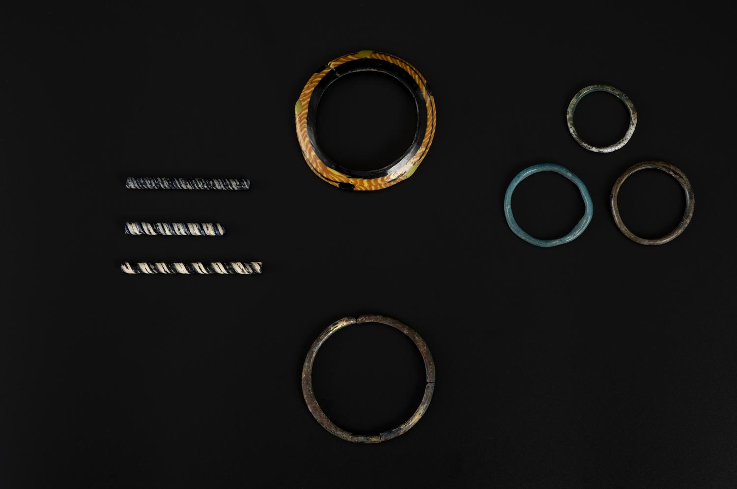 Quattro armille di differenti diametri ed una di dimensioni maggiori con decoro in giallo e arancio su fondo blu; tre canne vitree a tortiglione in vetro bianco e blu