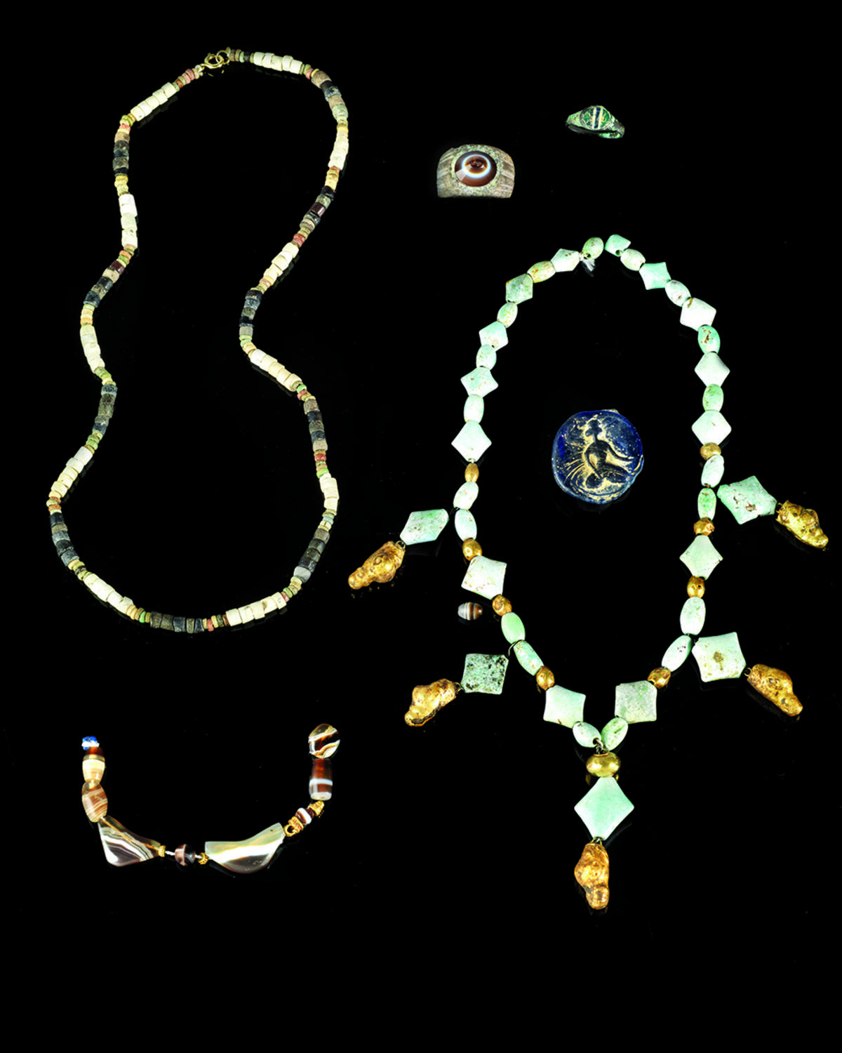Anello in argento con tre nervature in rilievo e castone piramidale in agata con inciso un piccolo delfino; anello in bronzo con castone ovale in pasta vitrea incisa verde, blu e bianca che imita un'agata-calcedonio; collana costituita da piccoli vaghi circolari in paste vitree colorate completa di fermatura moderna in oro; collana in faience azzurra con vaghi romboidali e pendenti a testa di cigno in oro, parte di collana in agata striata e oro, applique in vetro blu con figura femminile (6)