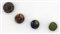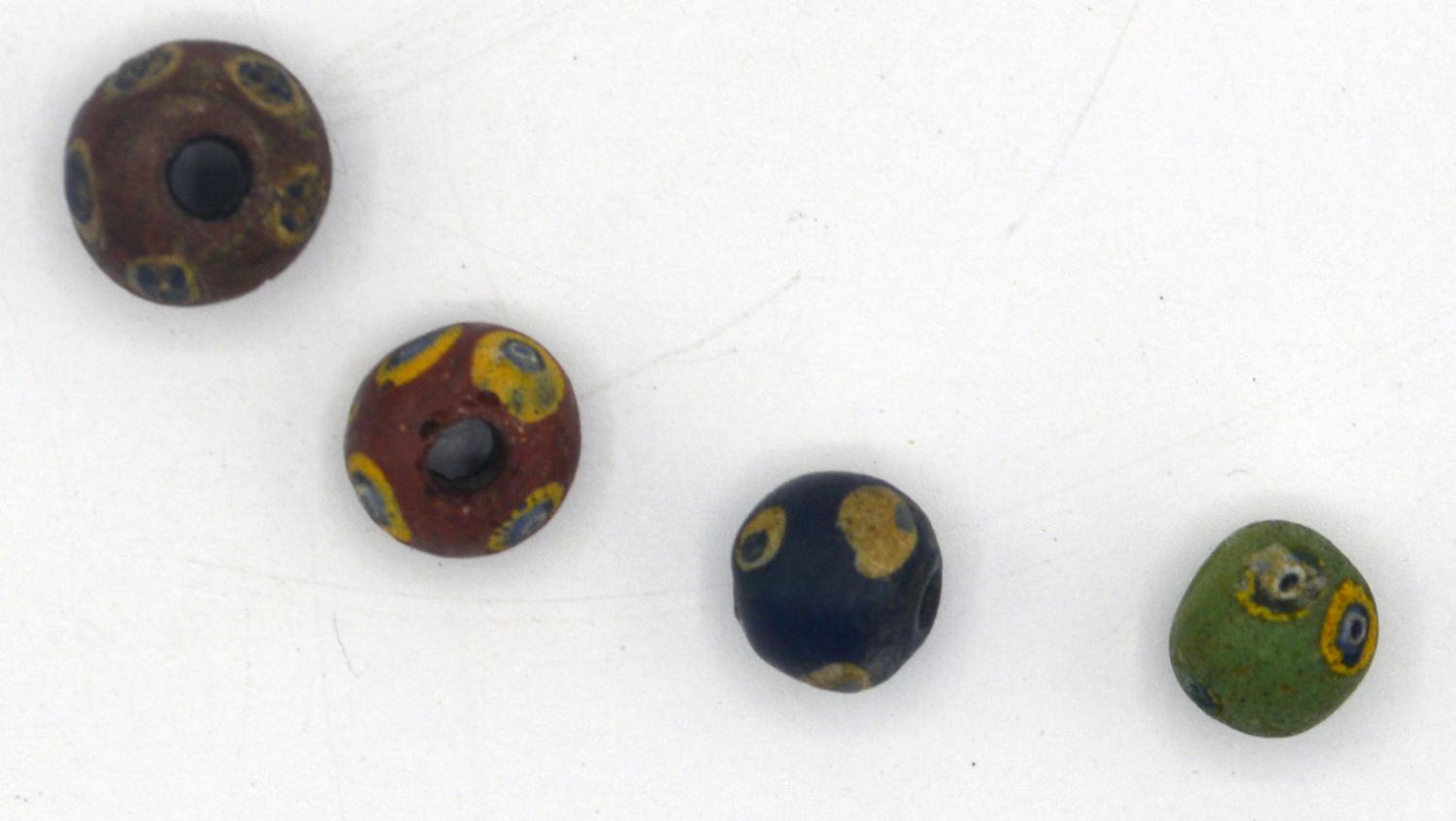 Quattro vaghi globulari in pasta vitrea blu, rossa, e verde, decorati a murrine con ?occhi?.