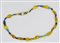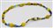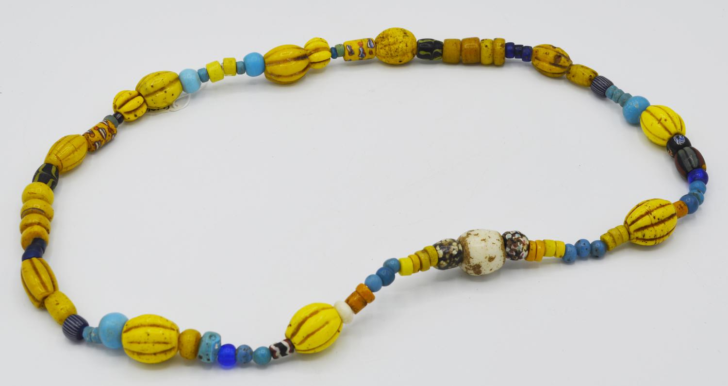 Collana melanesiana formata da vaghi ellittici scanalati in pasta vitrea gialla e vaghi cilindrici e sferici in pasta vitrea turchese, nera e bianca.