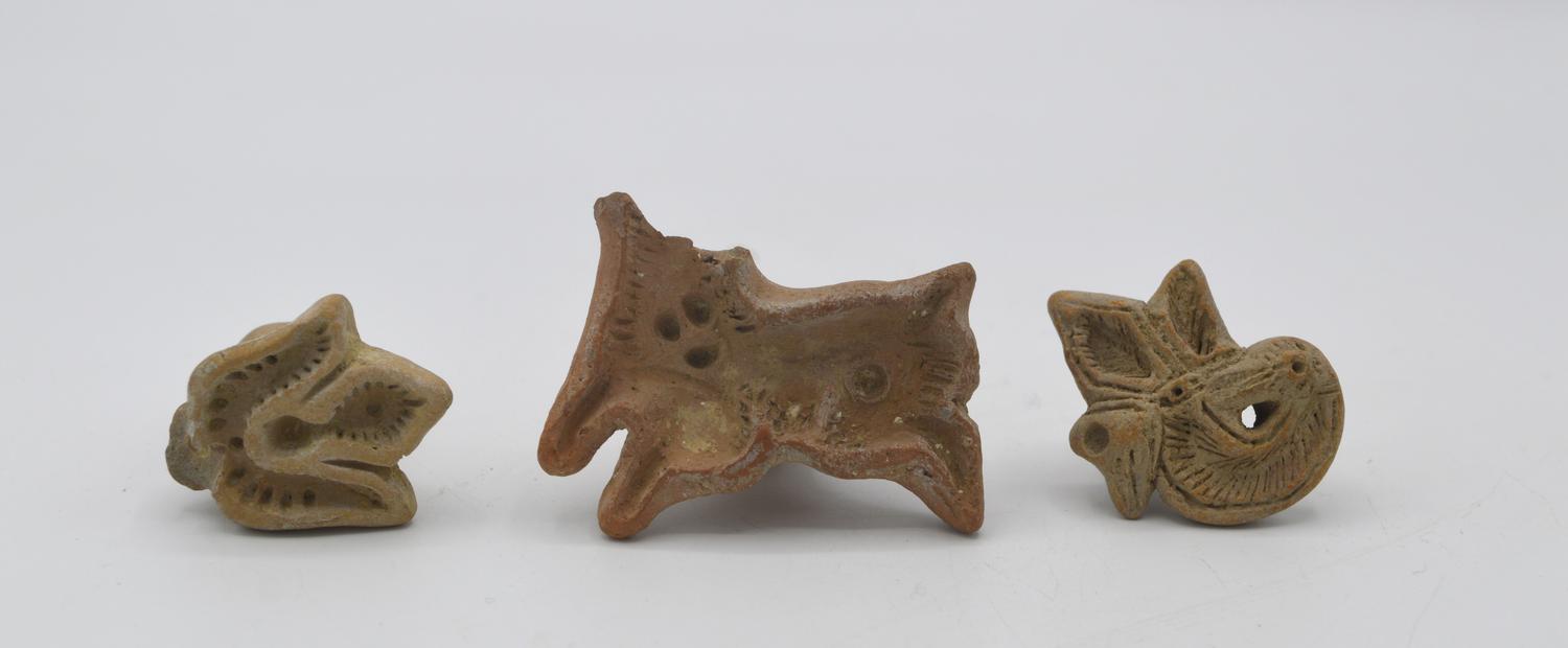 Due sigilli in terracotta raffiguranti due volatili stilizzati ed uno raffugurante un quadrupede stilizzato. (3)
