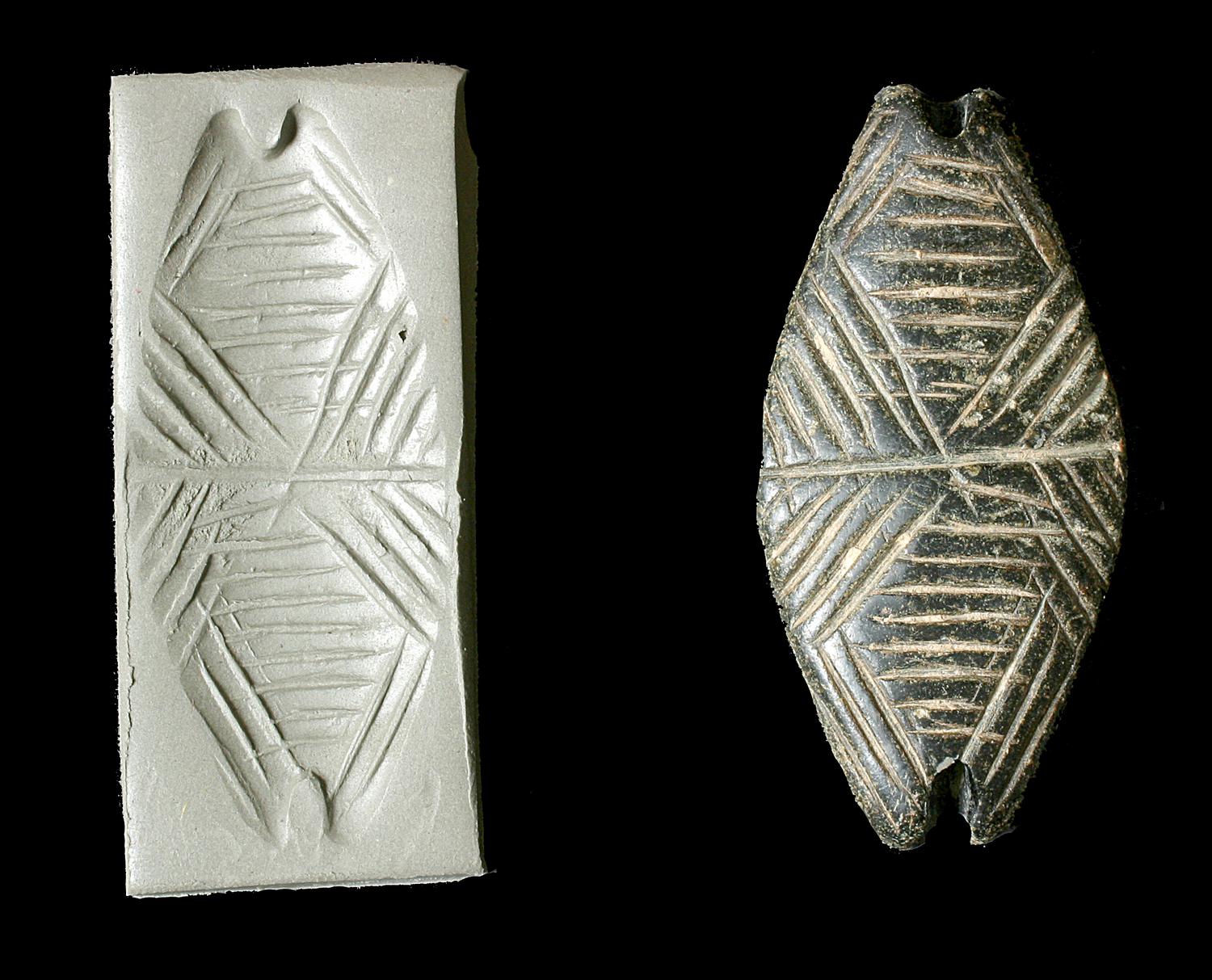 Sigillo a stampo a forma di ghianda romboidale, in steatite con decorazione a motivi geometrici; con una delle due facce completamente coperta da incisioni 'a canestro' con una linea verticale che divide il campo in due settori, foro passante sull'asse maggiore.