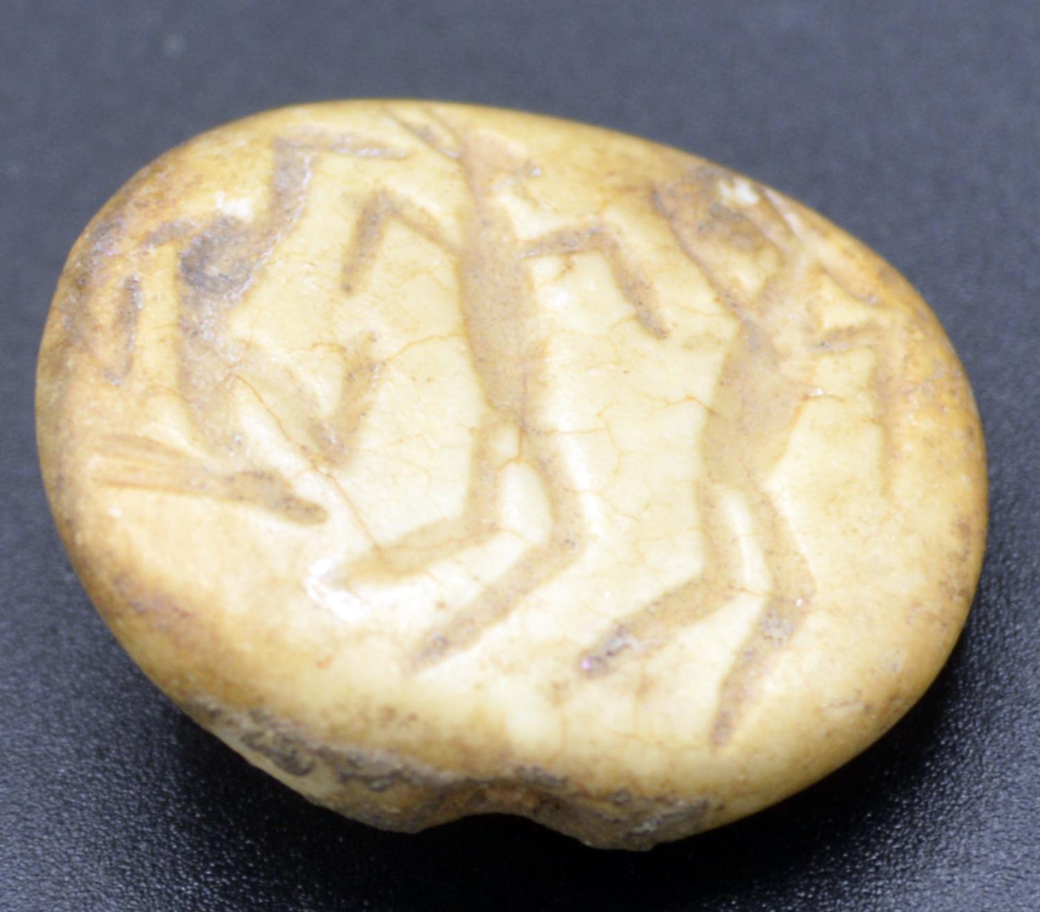 Sigillo a stampo in pietra giallo crema carenato e con foro passante; l'incisione rappresenta una scena rituale (sciamanica?) che vede protagonisti due uomini con maschere animali (ibex?) in atteggiamento di danza. A sinistra, un ibex disteso e un segno a V.