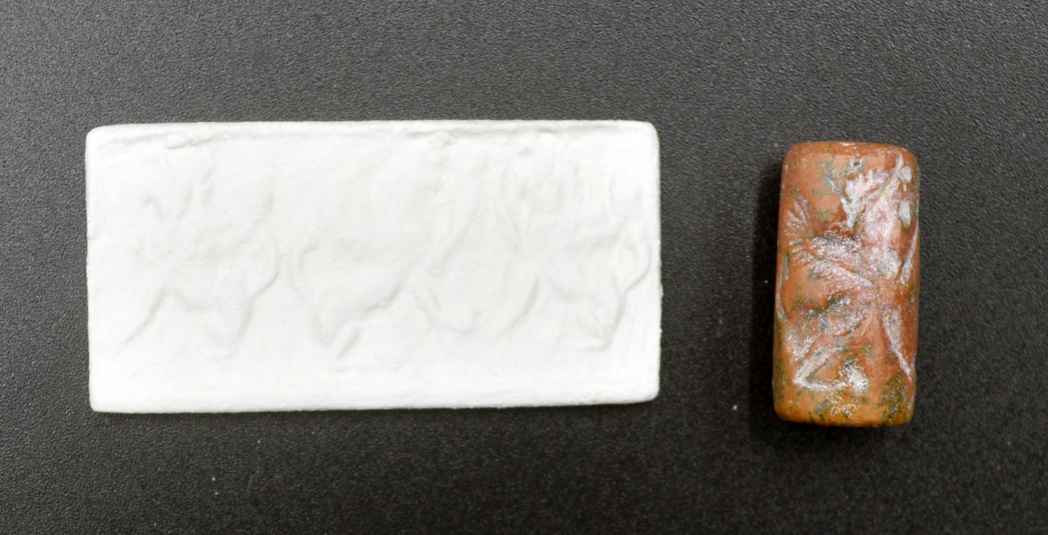 Sigillo cilindrico in marmo rosso mattone scuro con la rappresentazione di un grifone ed un grifo leone affrontati.