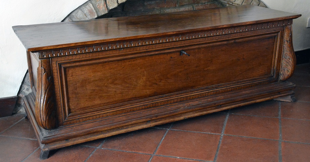 Cassapanca in noce con montanti a foglie cm.167x53,5x58 - XVIII secolo
