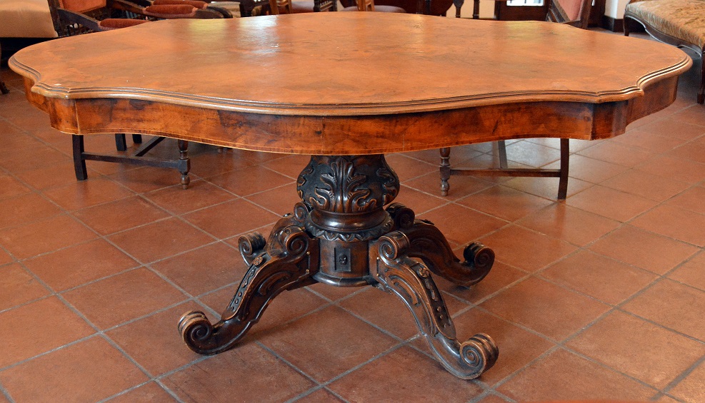 Lotto 81 | Tavolo da pranzo a biscotto in noce e radica di noce a gamba centrale e piano...