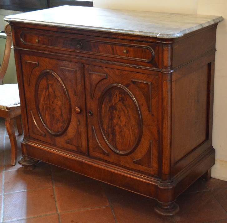 Comò in noce e radica di noce con piano in marmo grigio e piedi a cipolla cm.120x58x102 - fine XIX secolo