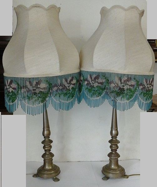 Coppia di lampade in metallo a piedi ferini con paralumi decorati a perline h.cm.73