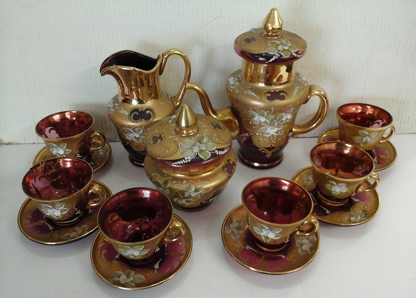 Servizio da caffè in vetro soffiato e dorato K24 - decorato a rilievo -...
