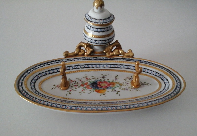 Calamaio Limoges in porcellana decorata e dorata - portapenna in metallo dorato cm.20x15x10
