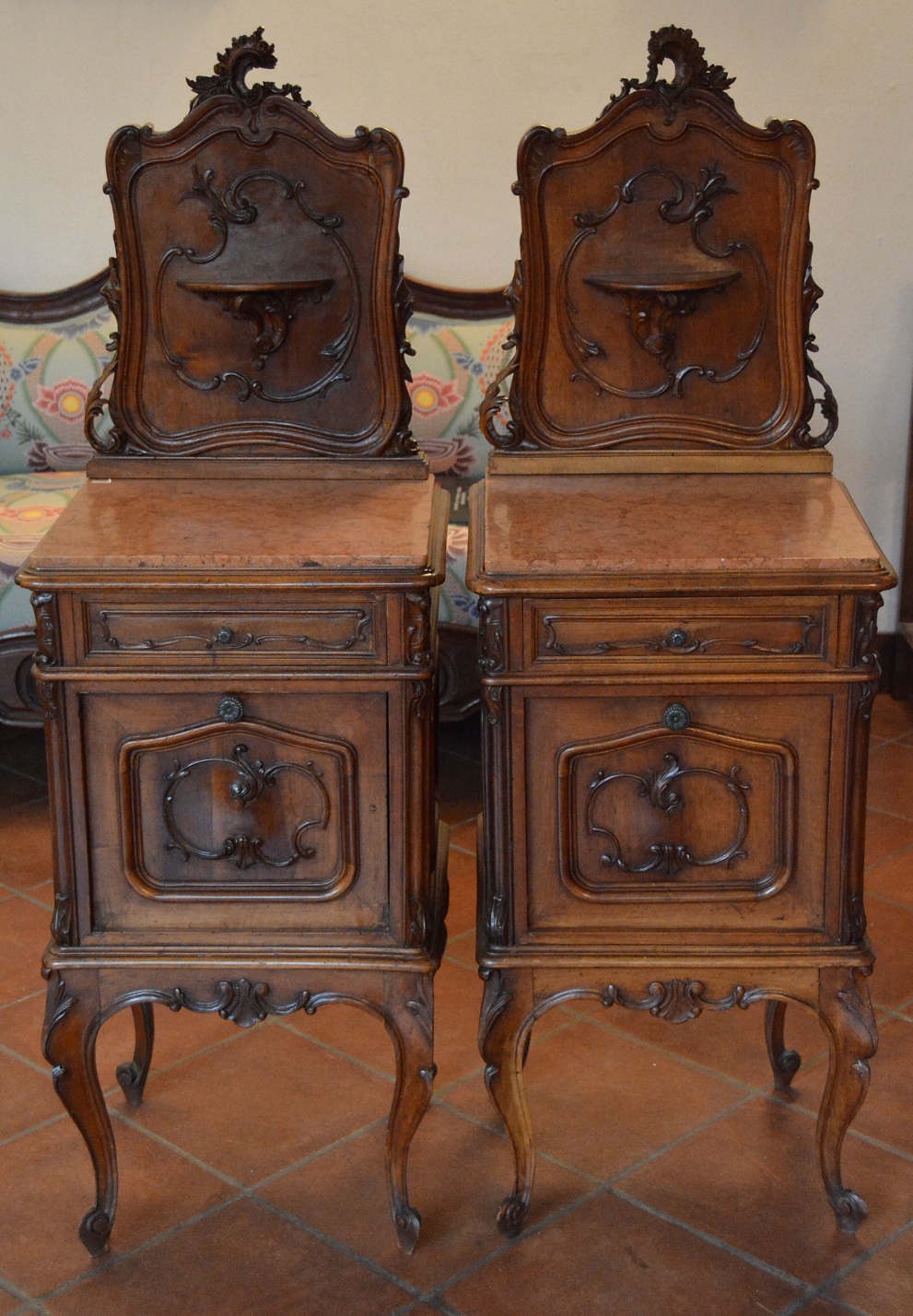 Coppia di comodini Liberty in noce - piano in marmo cm.44x39x132