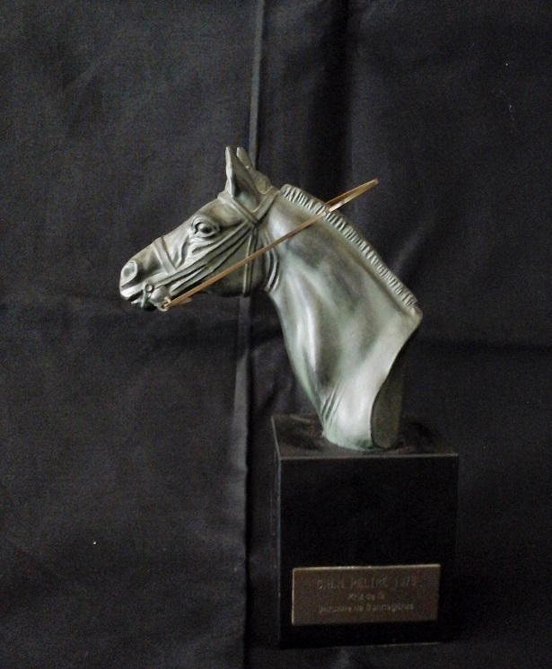 Trofeo equestre in metallo con base in marmo - "Prix de la Baronne de Bonnegarde 1975" h.cm.19