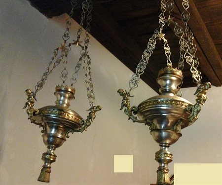 Coppia di lampade a sospensione in metallo argentato e dorato con putti alati